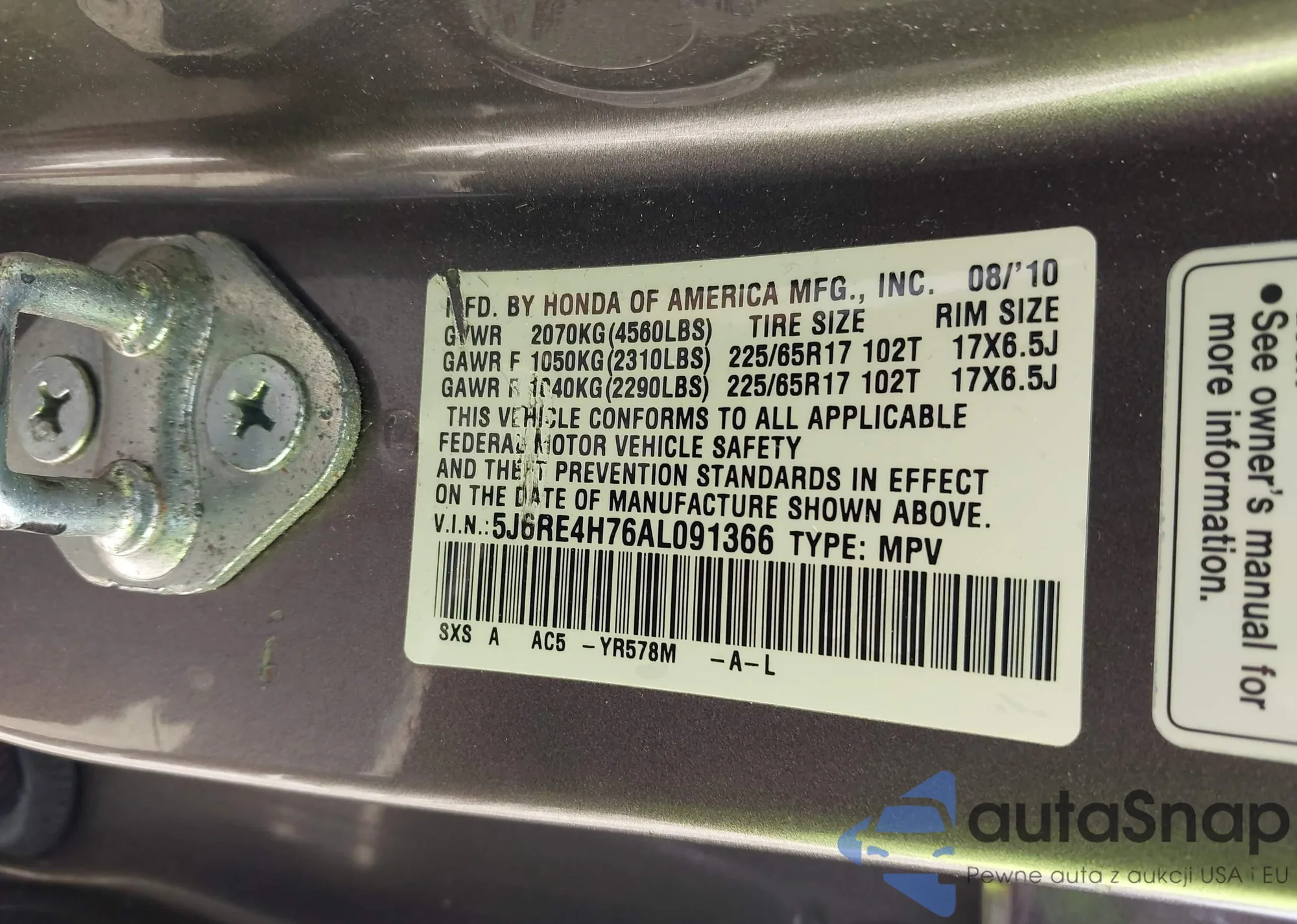 • VIN 5J6RE4H76AL091366