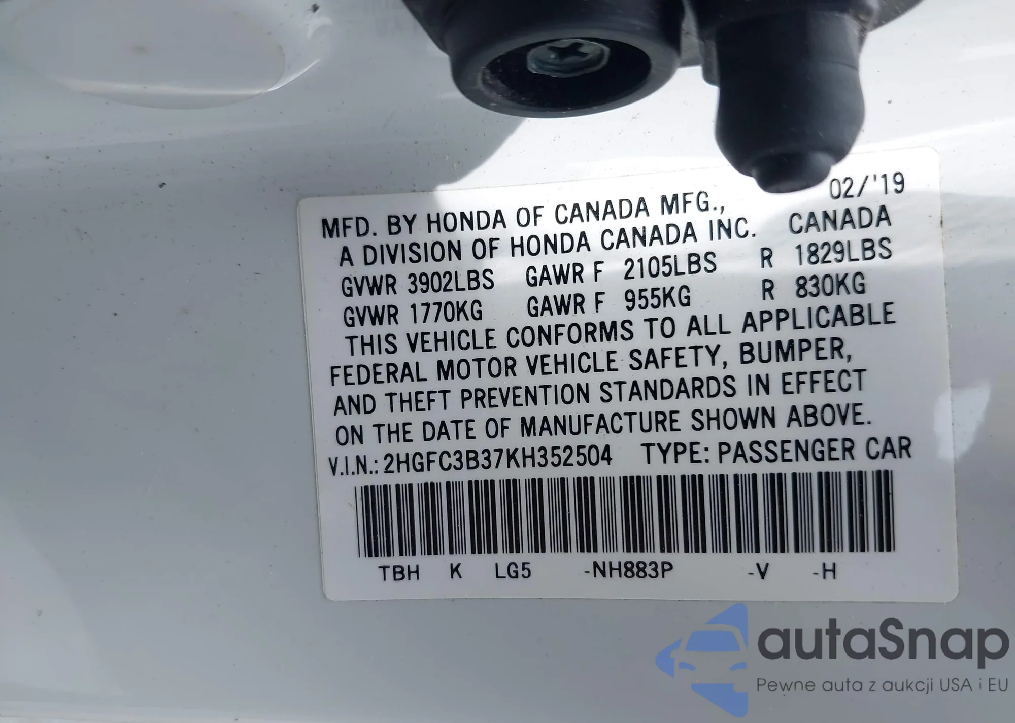 • VIN 2HGFC3B37KH352504