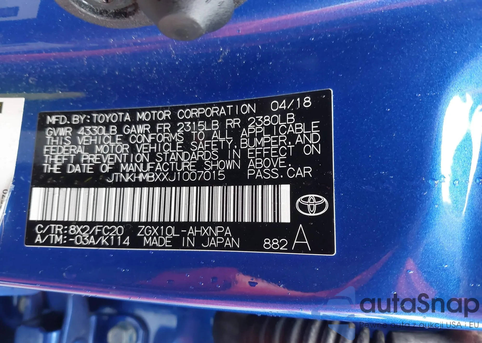 LOT: 42495803 VIN: JTNKHMBXXJ1007015
