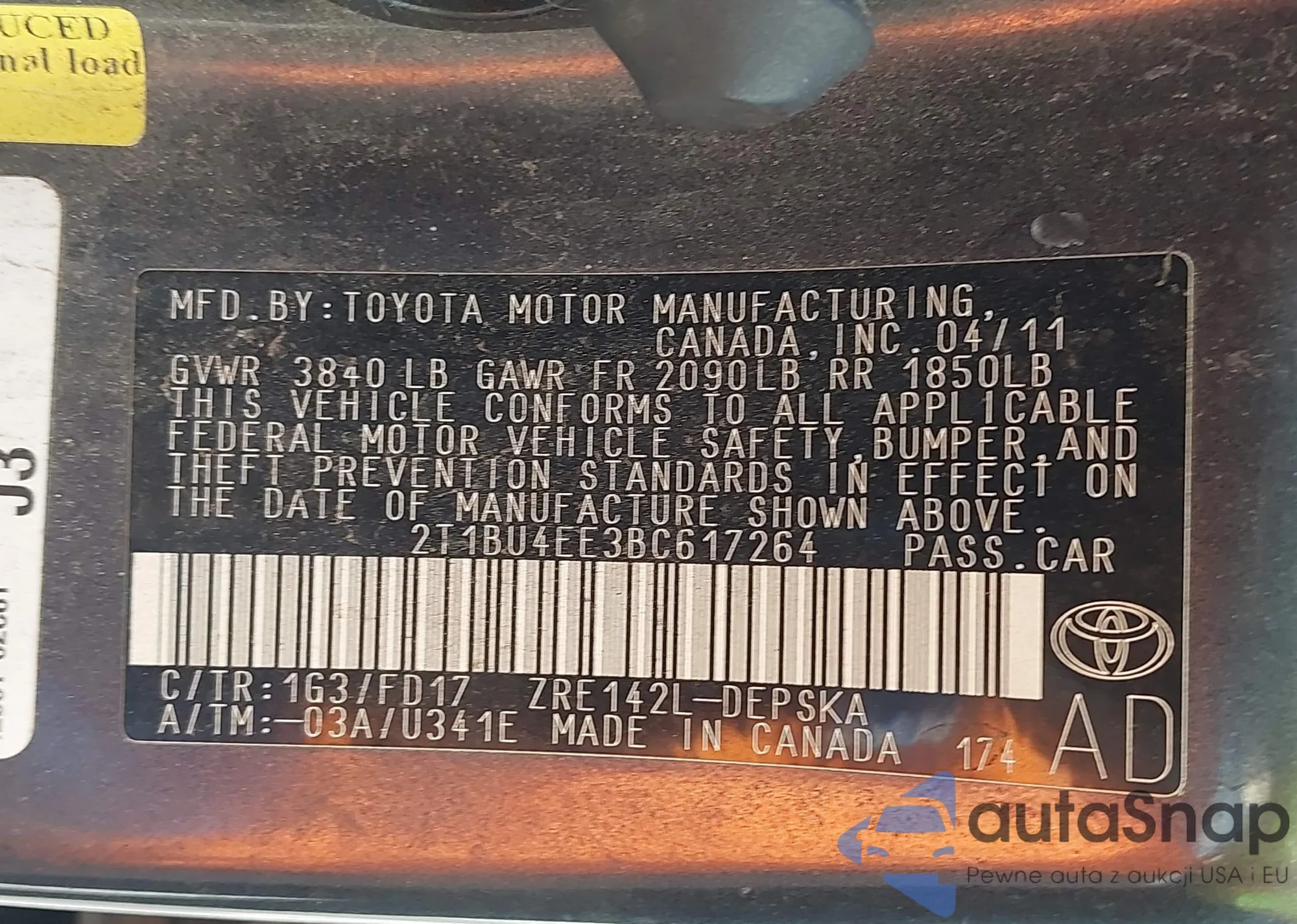 • VIN 2T1BU4EE3BC617264