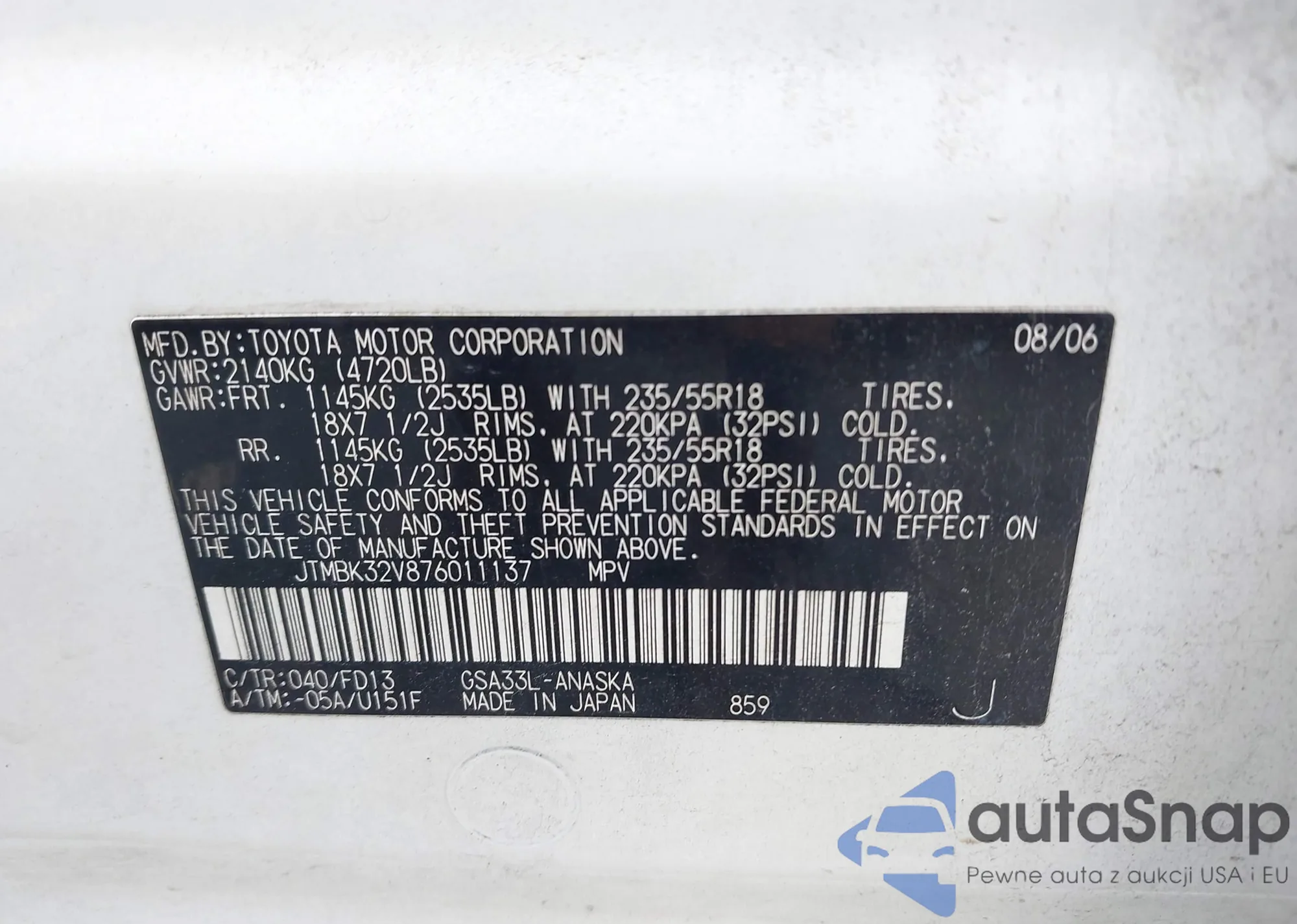 LOT: 42701223 VIN: JTMBK32V876011137