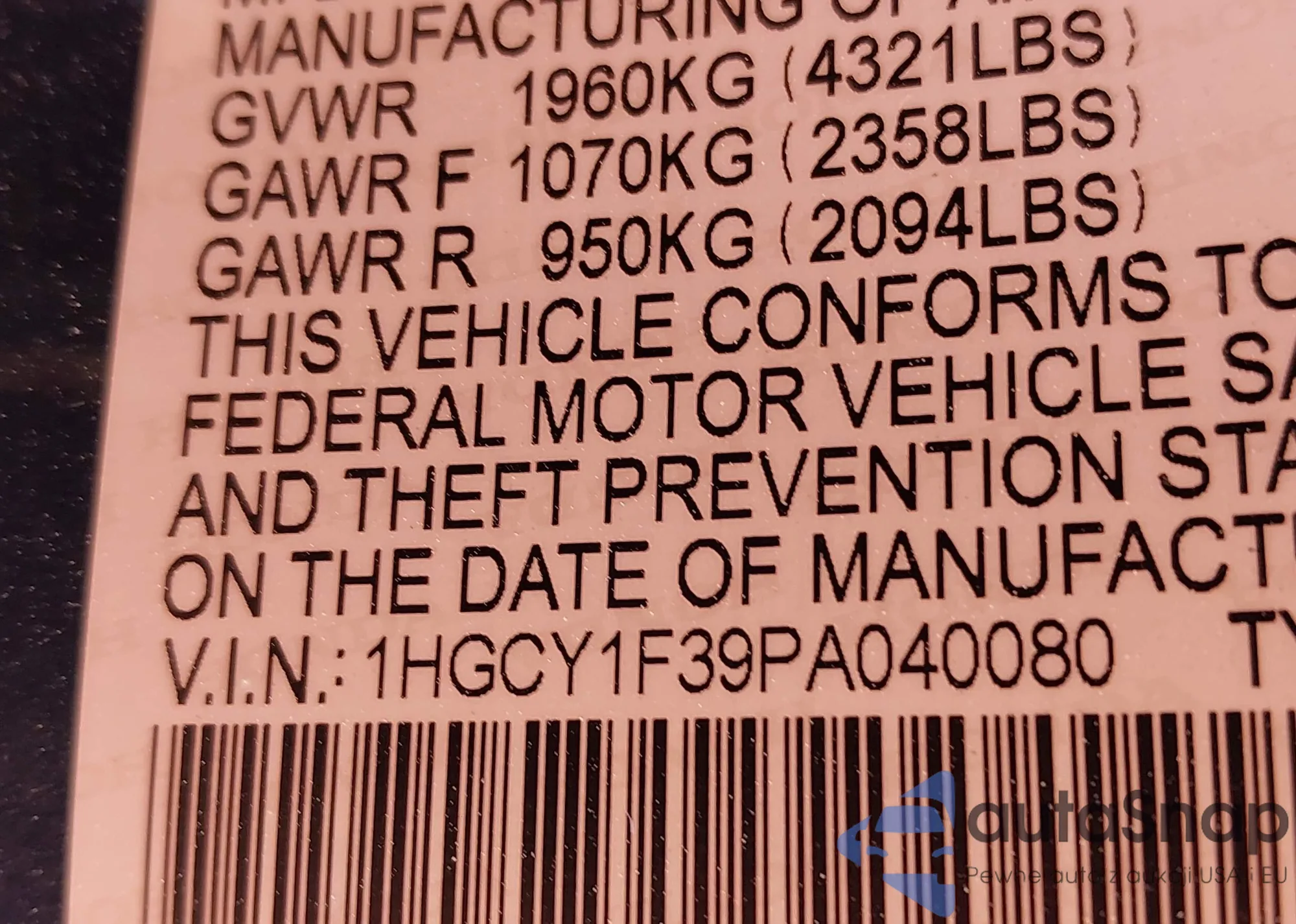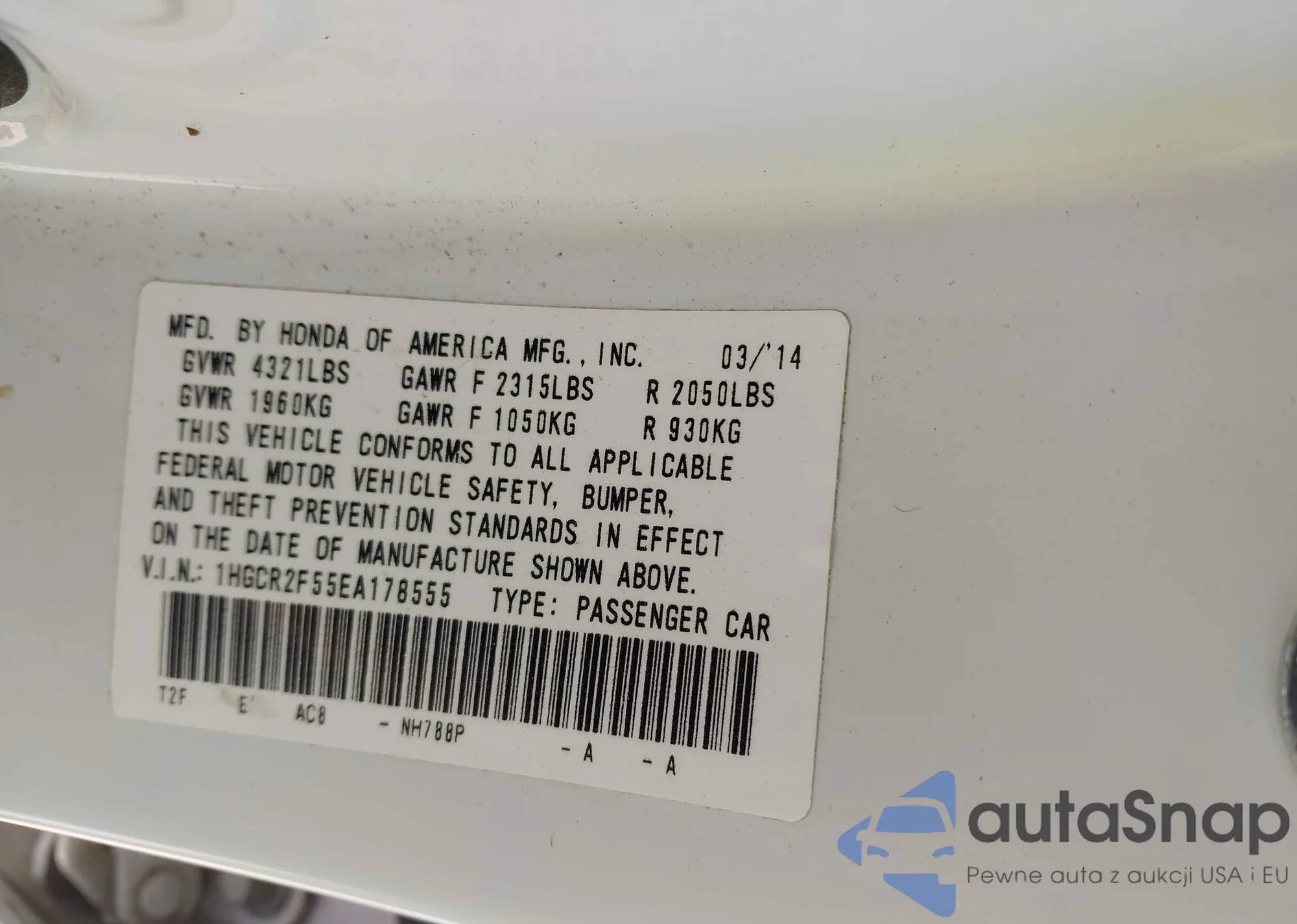 LOT: 41991762 VIN: 1HGCR2F55EA178555