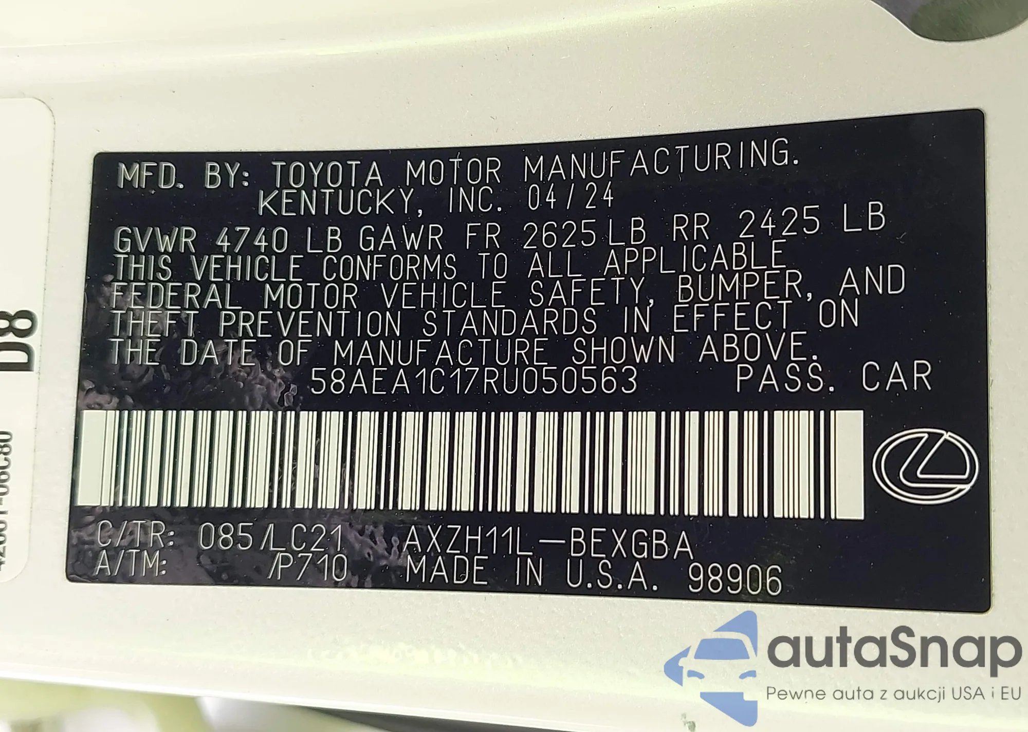 LOT: 42481783 VIN: 58AEA1C17RU050563