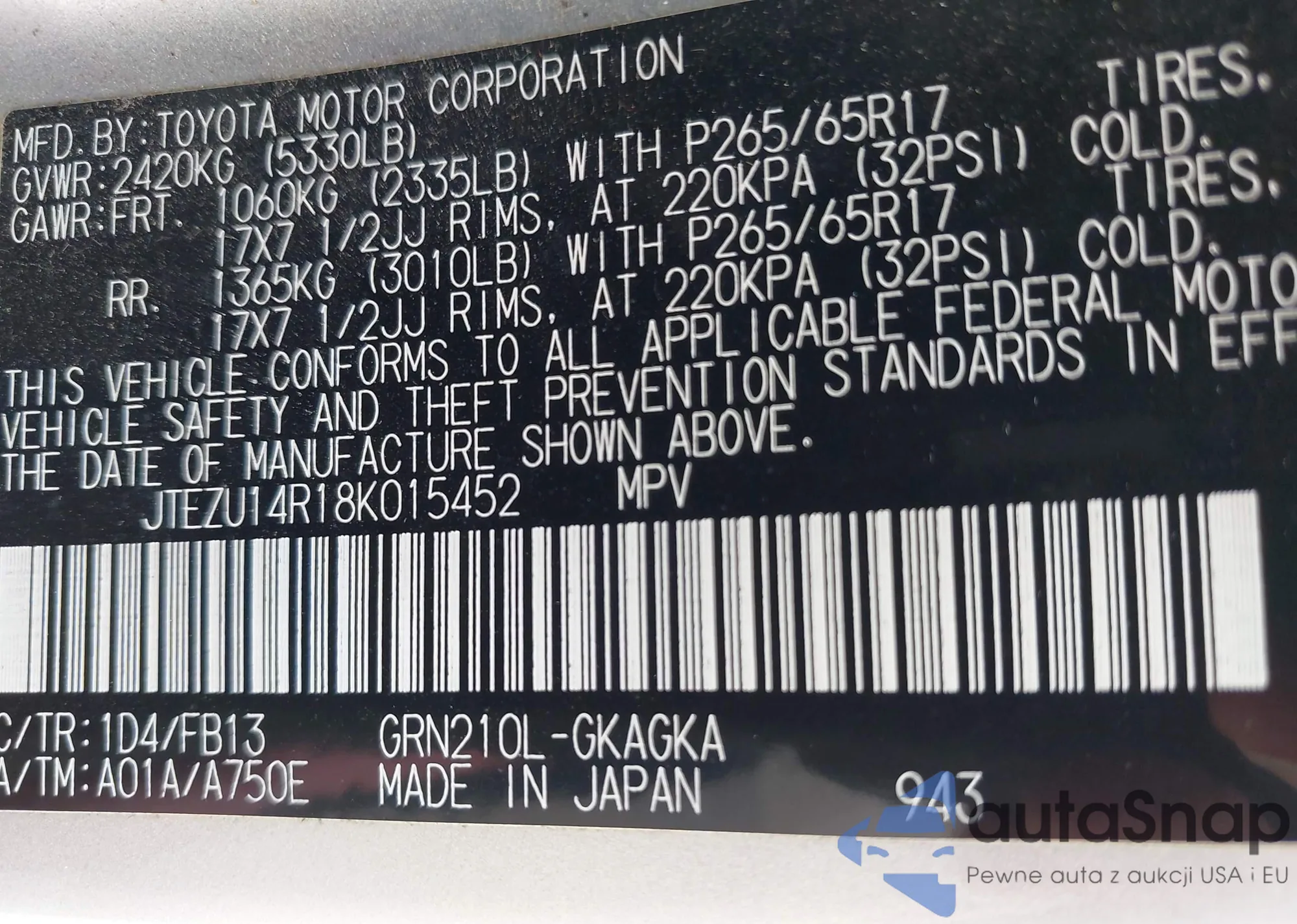 LOT: 42345644 VIN: JTJBM7FX5J5191099