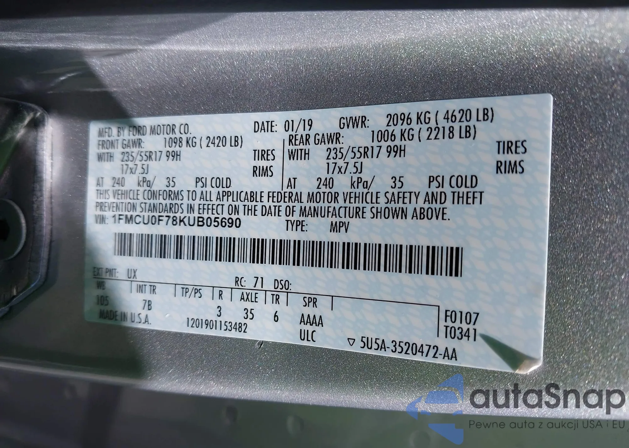• VIN 1FMCU0F78KUB05690