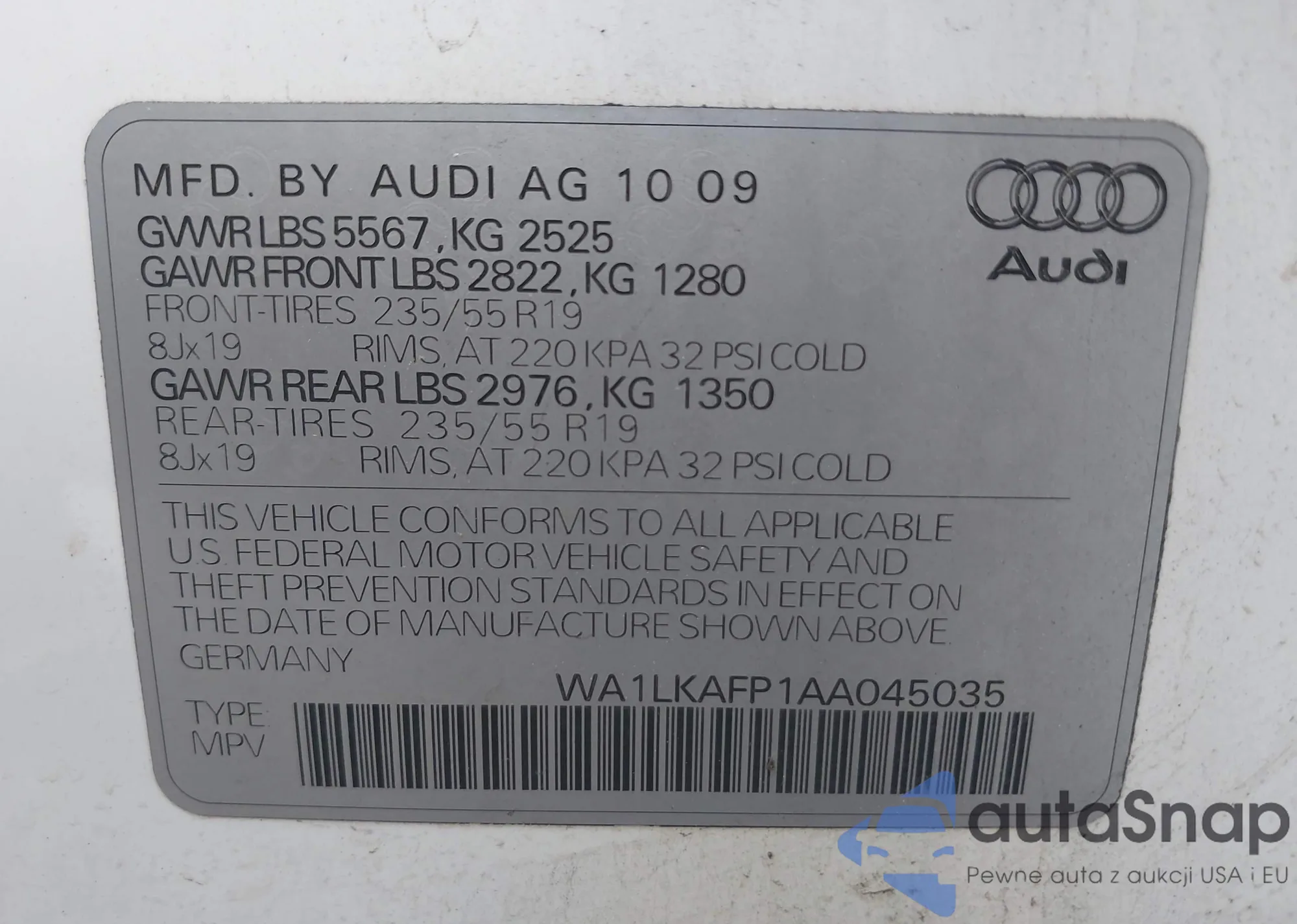 LOT: 42240670 VIN: WA1LKAFP1AA045035