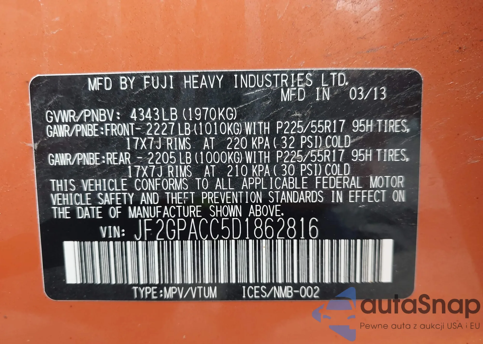 LOT: 42355188 VIN: JF2GPACC5D1862816