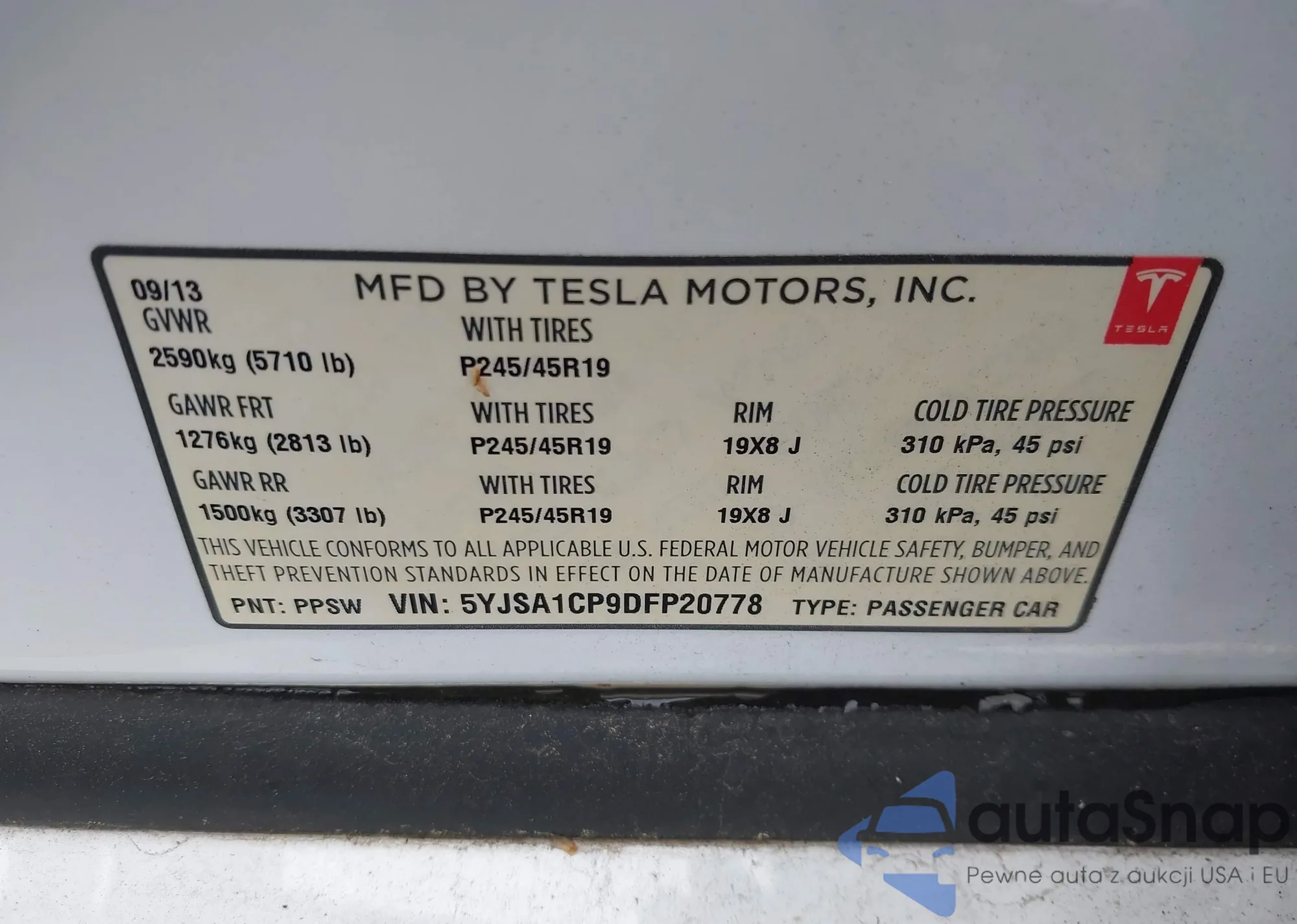 • VIN 5YJSA1CP9DFP20778