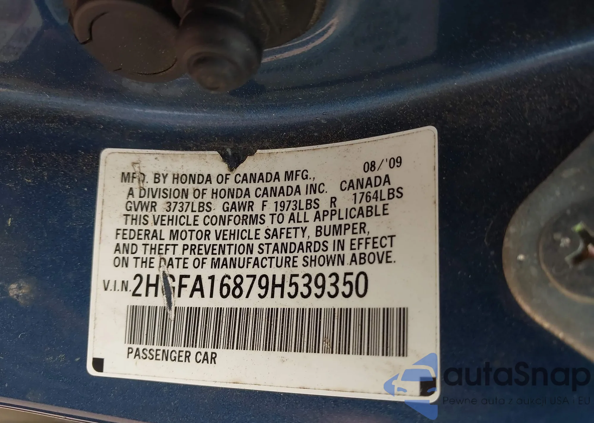 LOT: 42063987 VIN: 2HGFA16879H539350