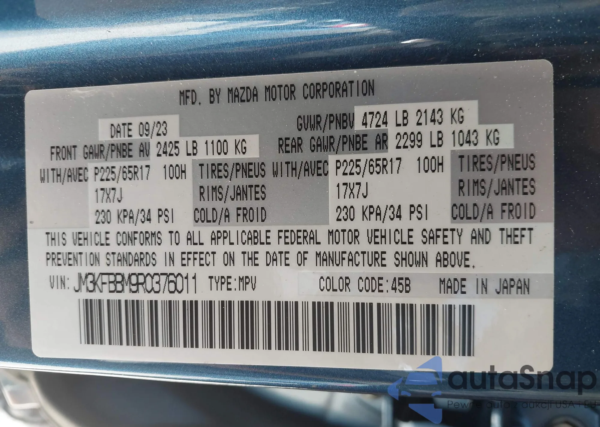 LOT: 42532429 VIN: JM3KFBBM9R0376011