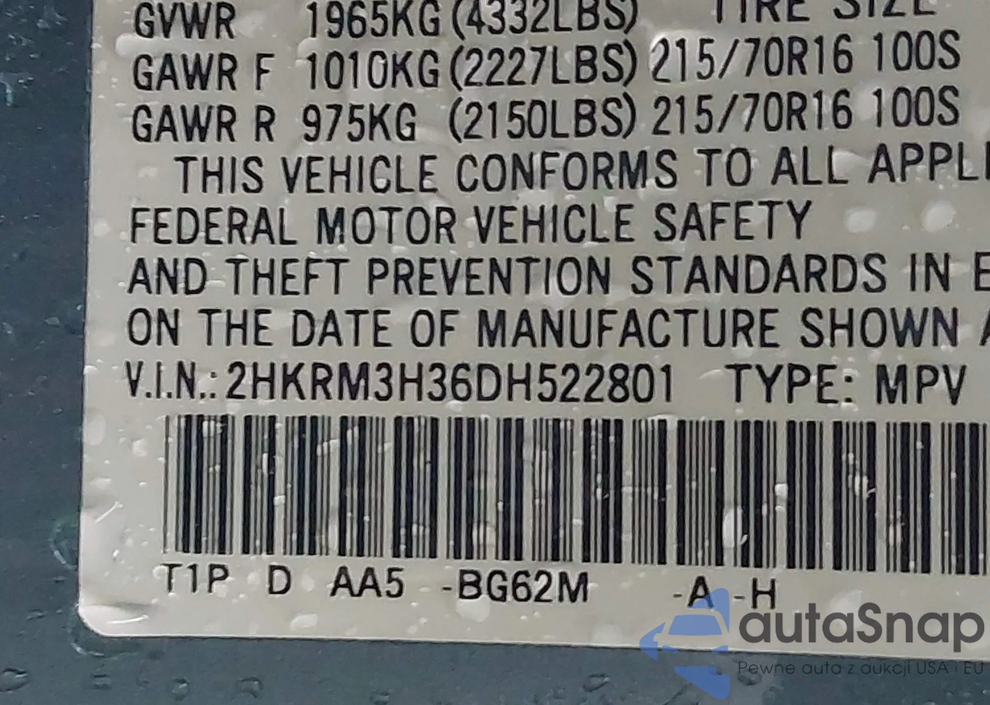 • VIN 2HKRM3H36DH522801
