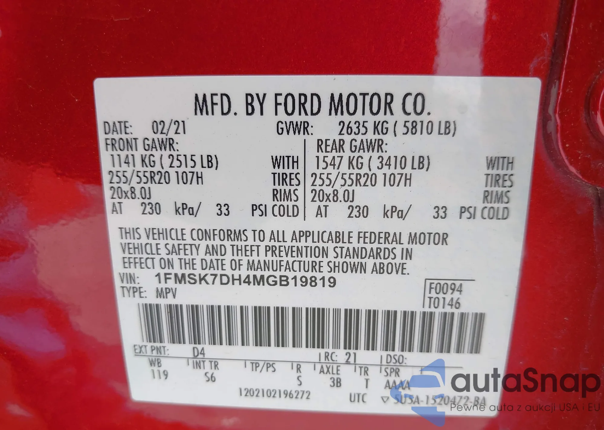 LOT: 41954703 VIN: MAJ6S3GL0LC349898
