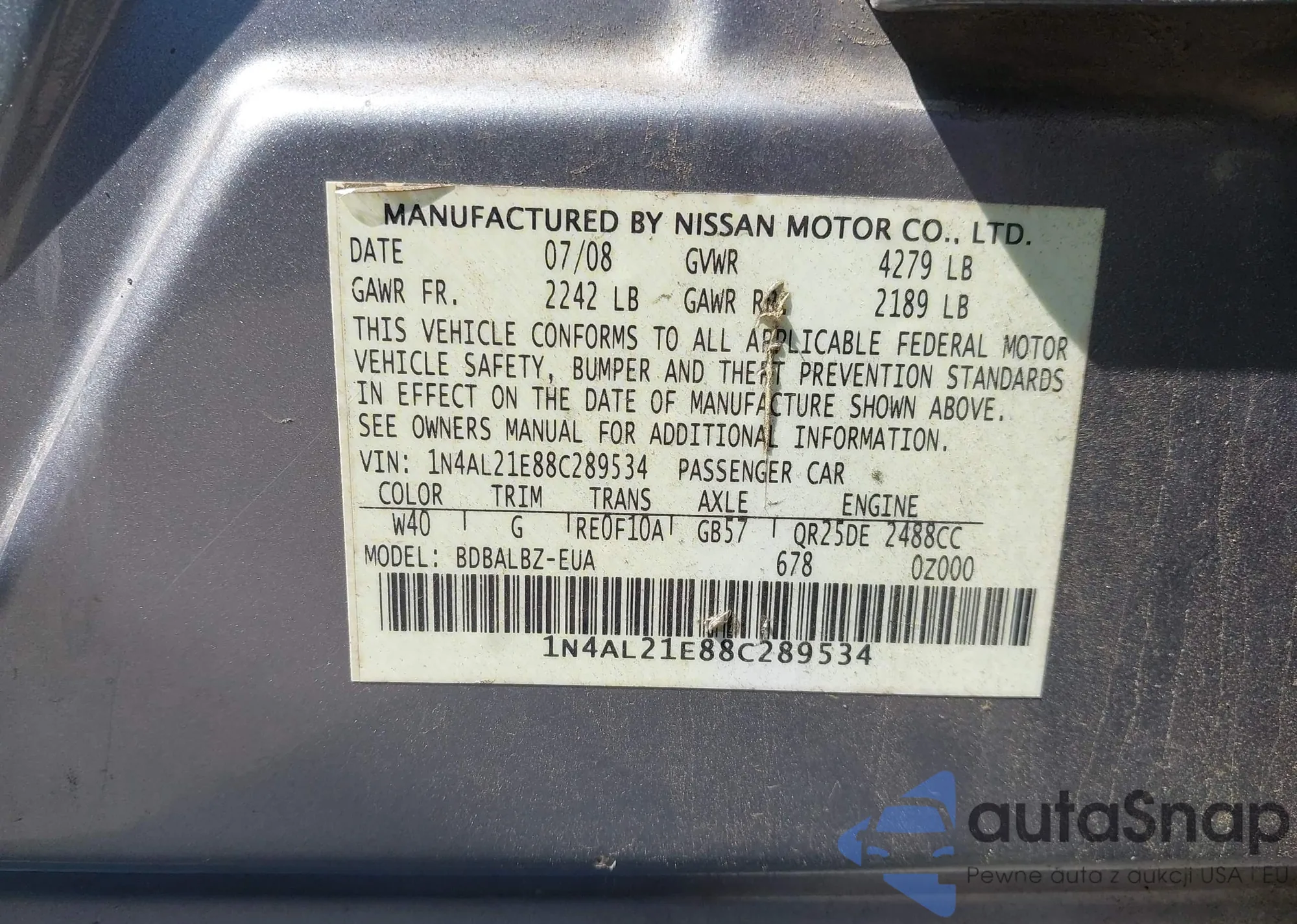 2008 Honda Accord 2.4 Lx-P from USA, damaged, VIN 1HGCP26468A024499