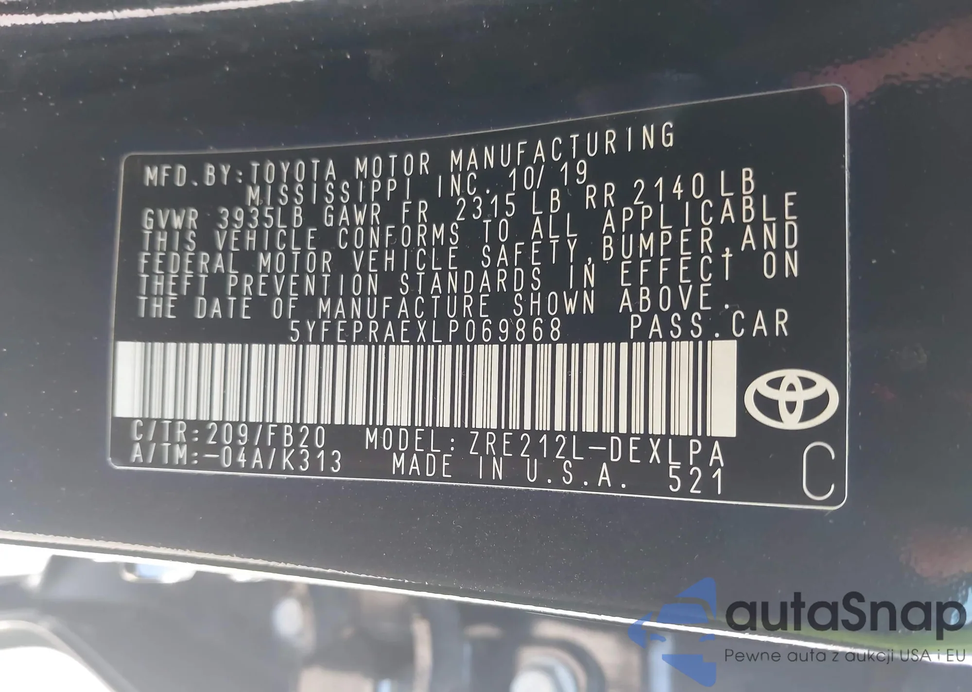 LOT: 42504206 VIN: 5YFEPRAEXLP069868
