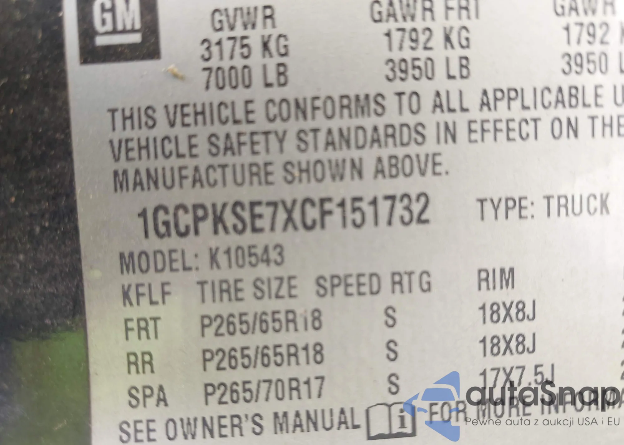 • VIN 1GCPKSE7XCF151732
