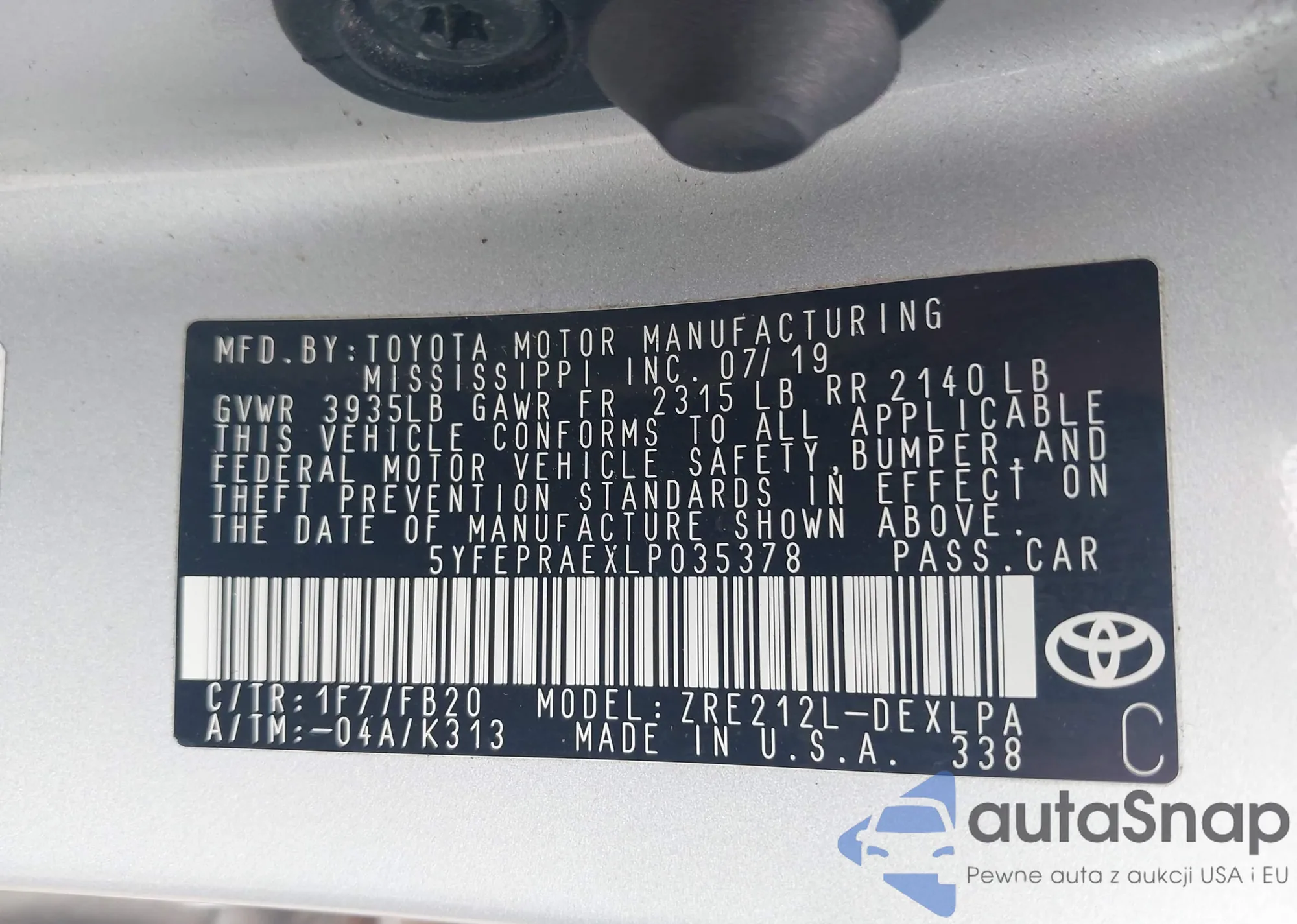 LOT: 42721577 VIN: 5YFEPRAEXLP035378