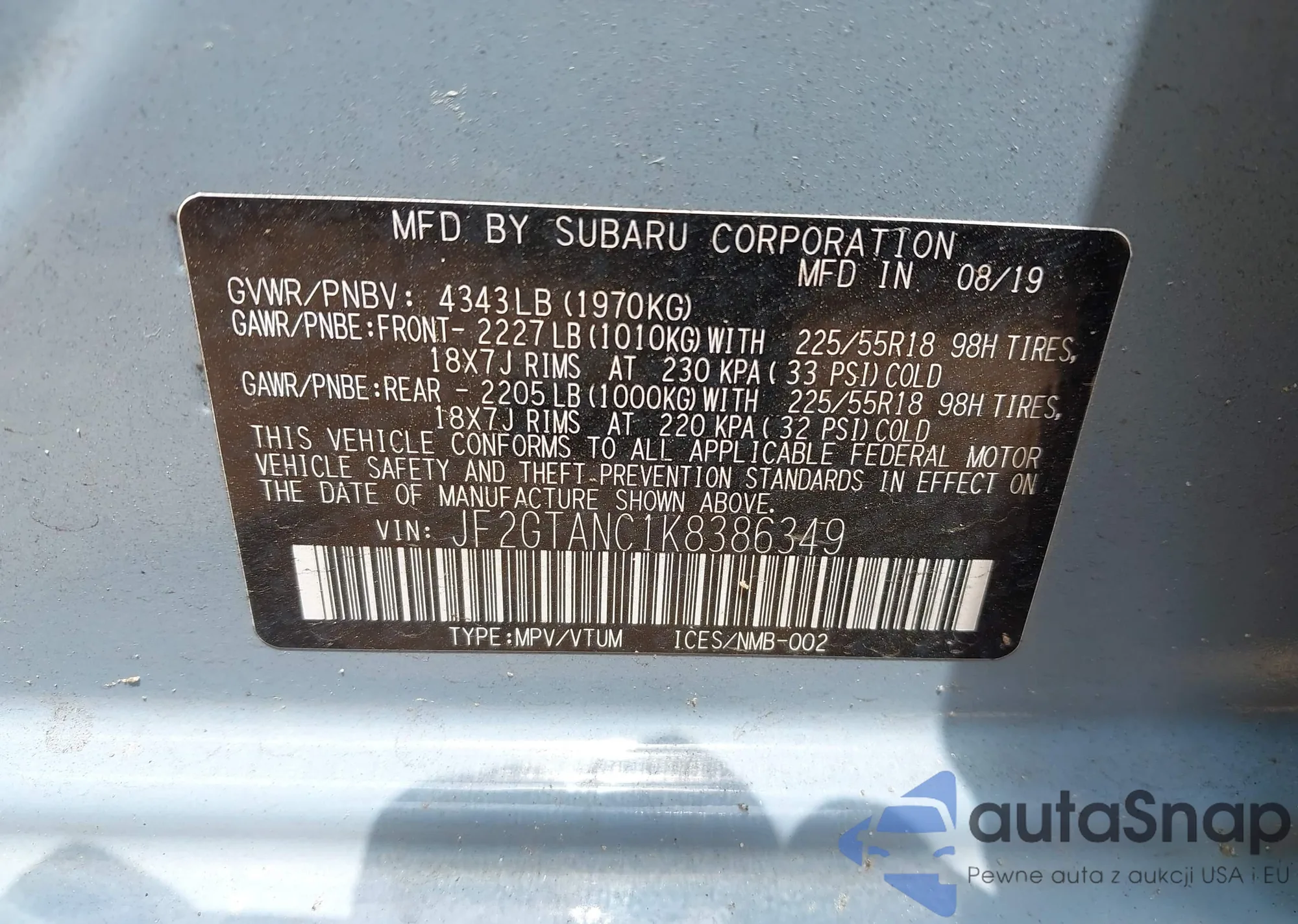 • VIN JF2GTANC1K8386349