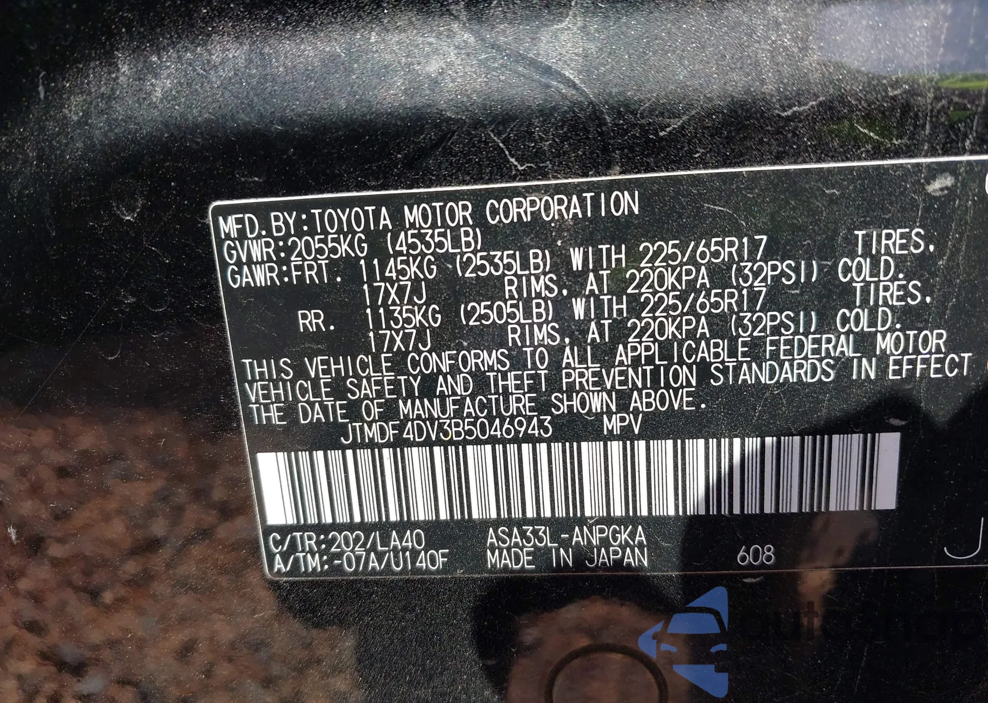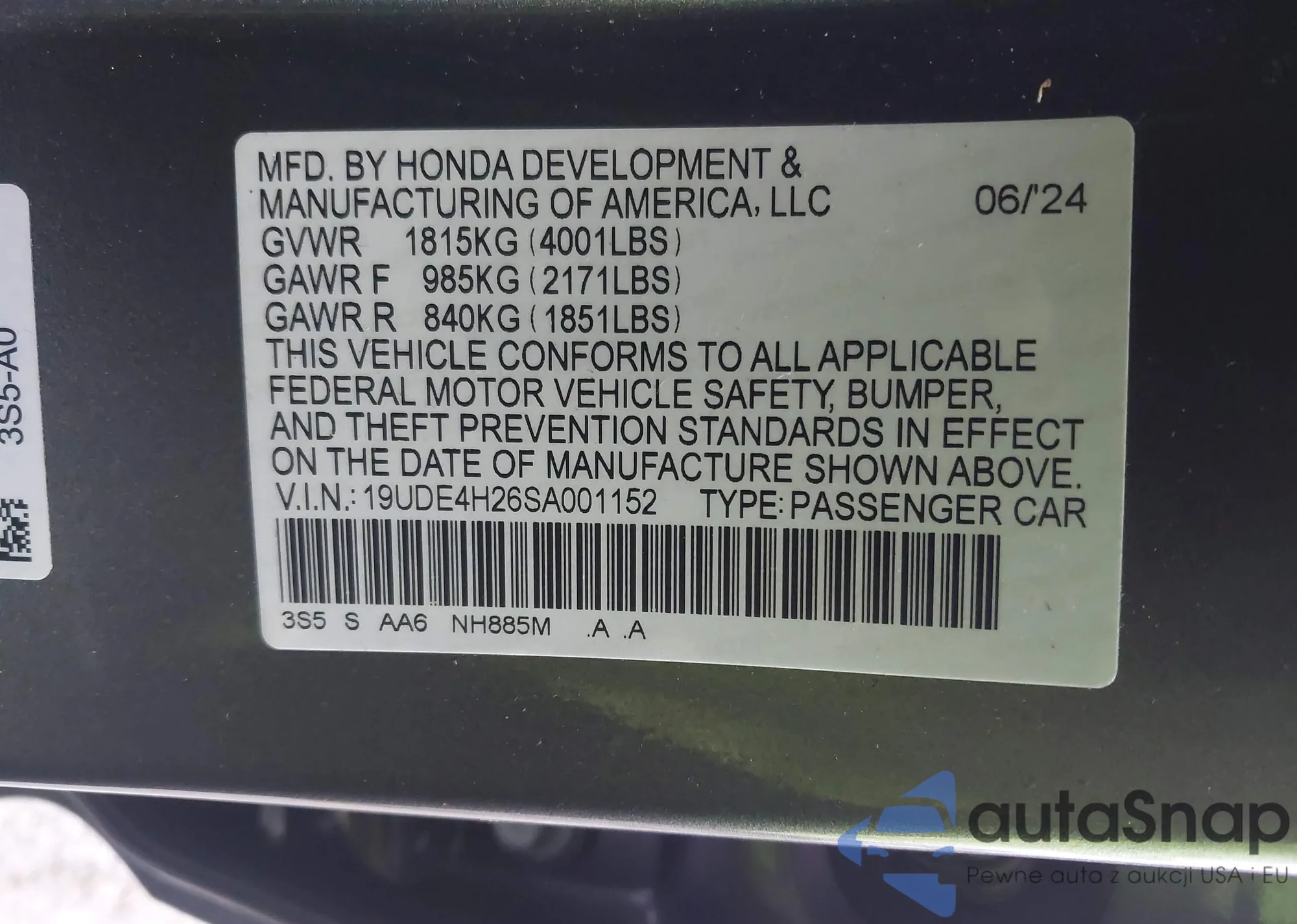 • VIN 19UDE4H26SA001152