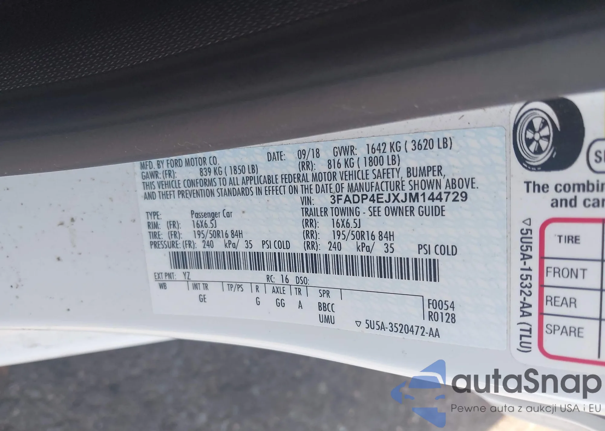 LOT: 42528491 VIN: 3FADP4EJXJM144729