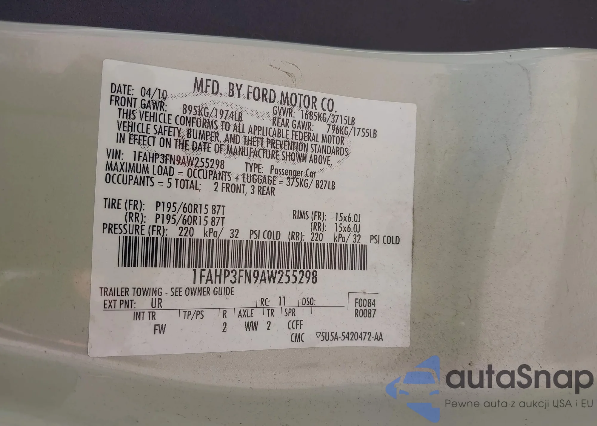 • VIN 1FAHP3FN9AW255298