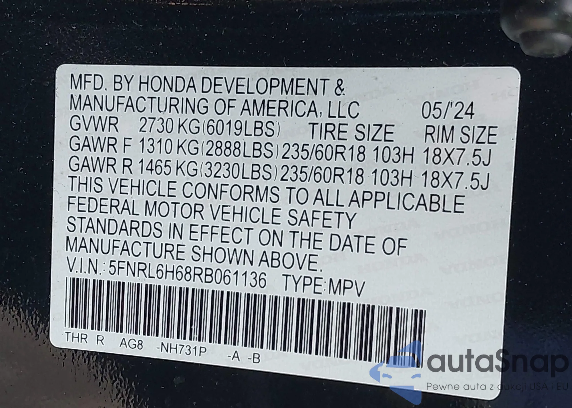 • VIN 5FNRL6H68RB061136