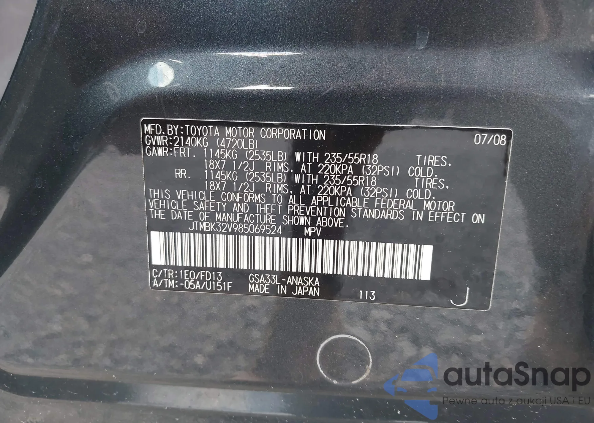 LOT: 42612319 VIN: JTMBK32V985069524