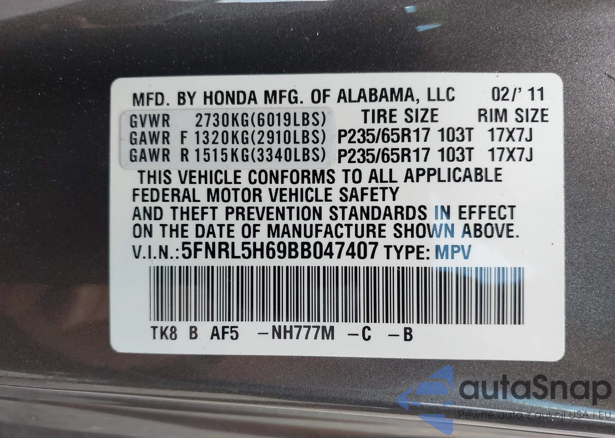 • VIN 5FNRL5H69BB047407