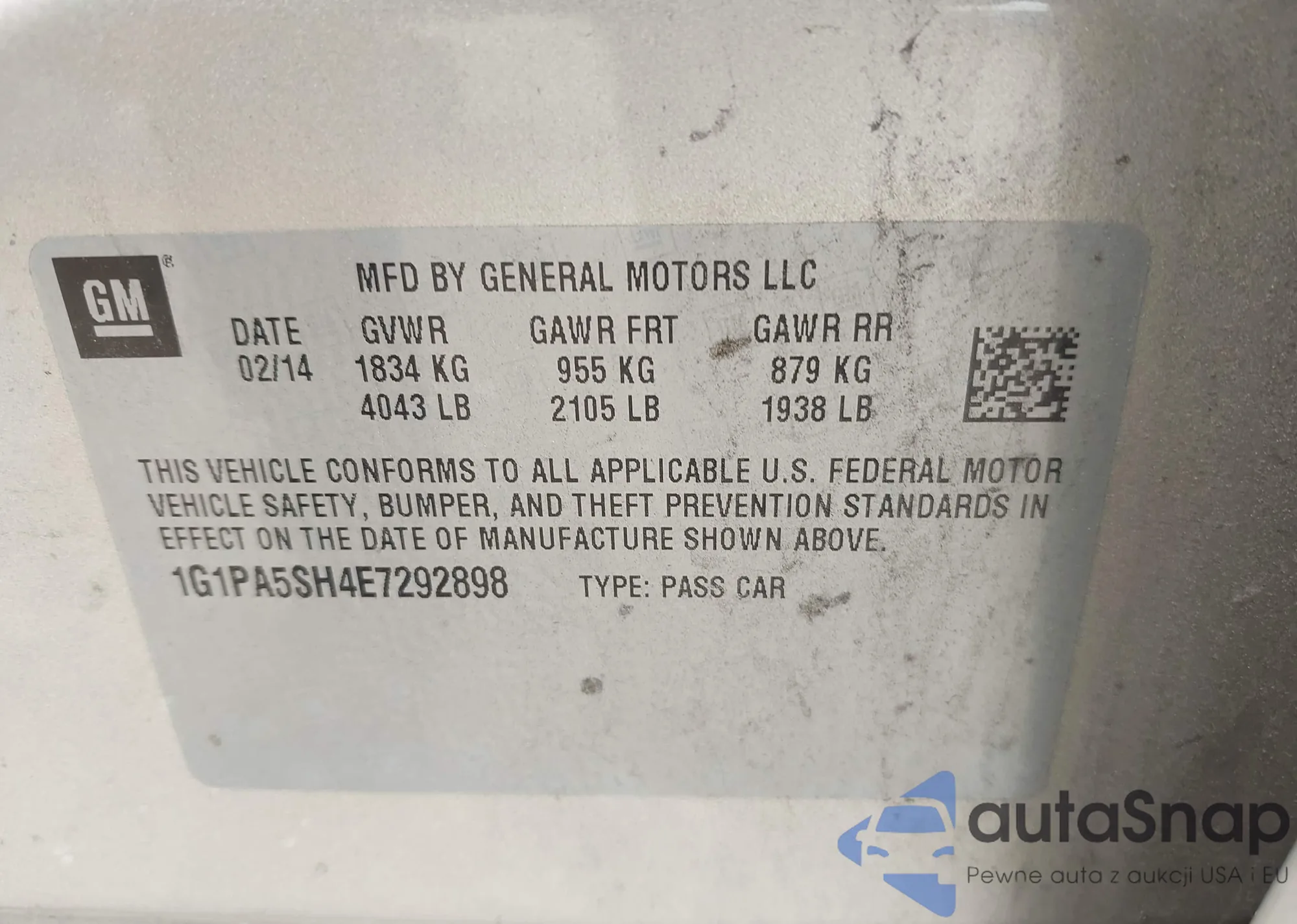 LOT: 42457553 VIN: 1G1PA5SH4E7292898