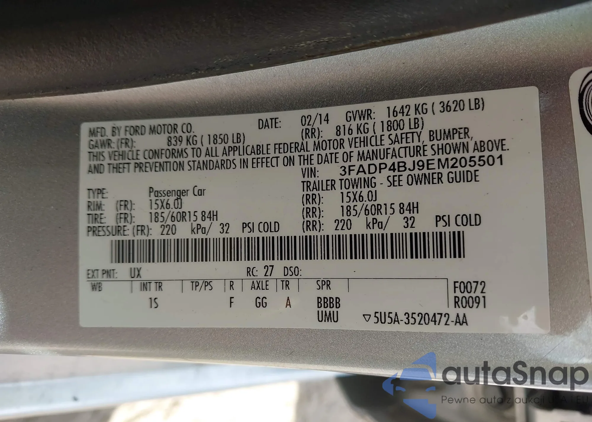 LOT: 42654047 VIN: 3FADP4BJ9EM205501