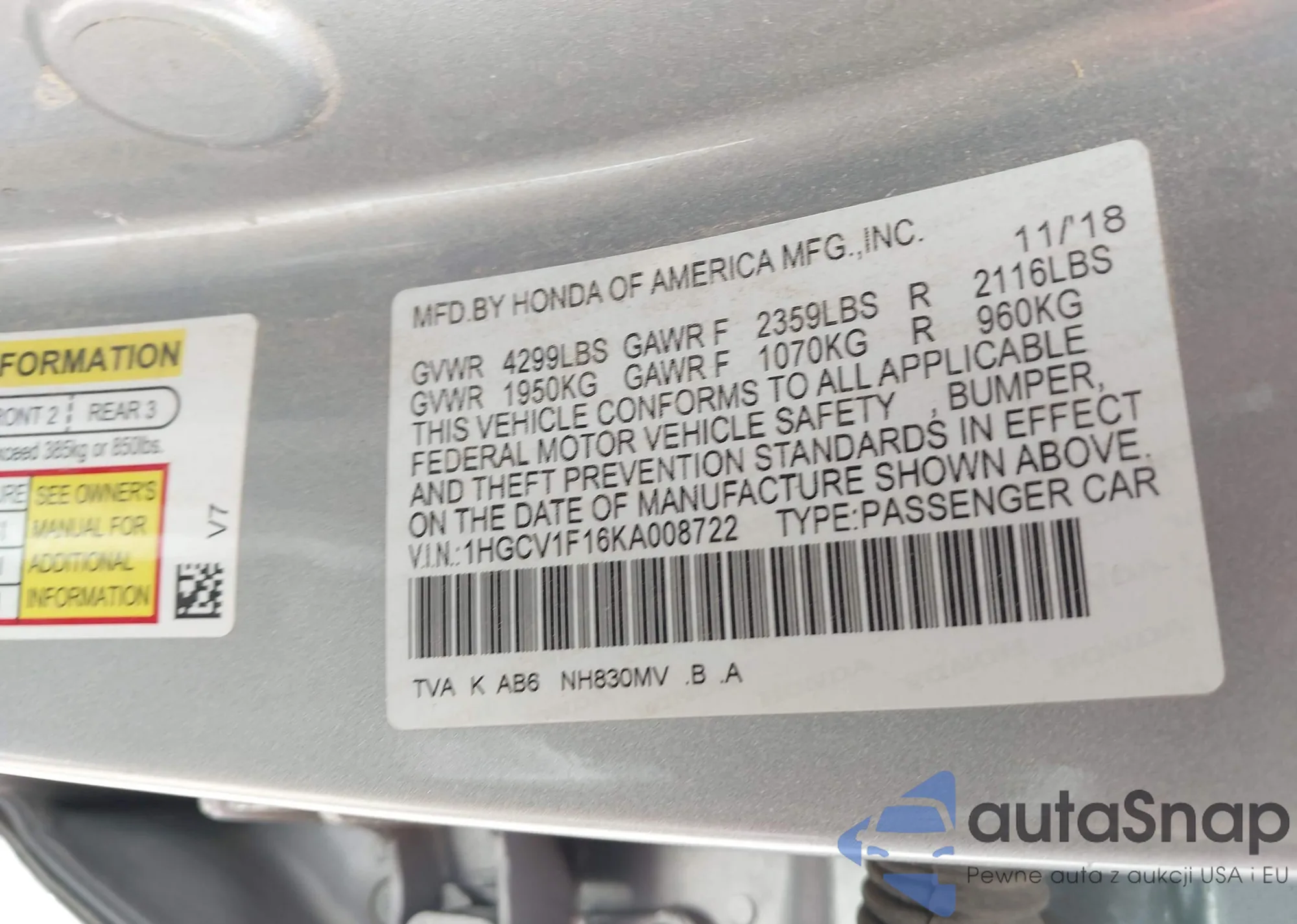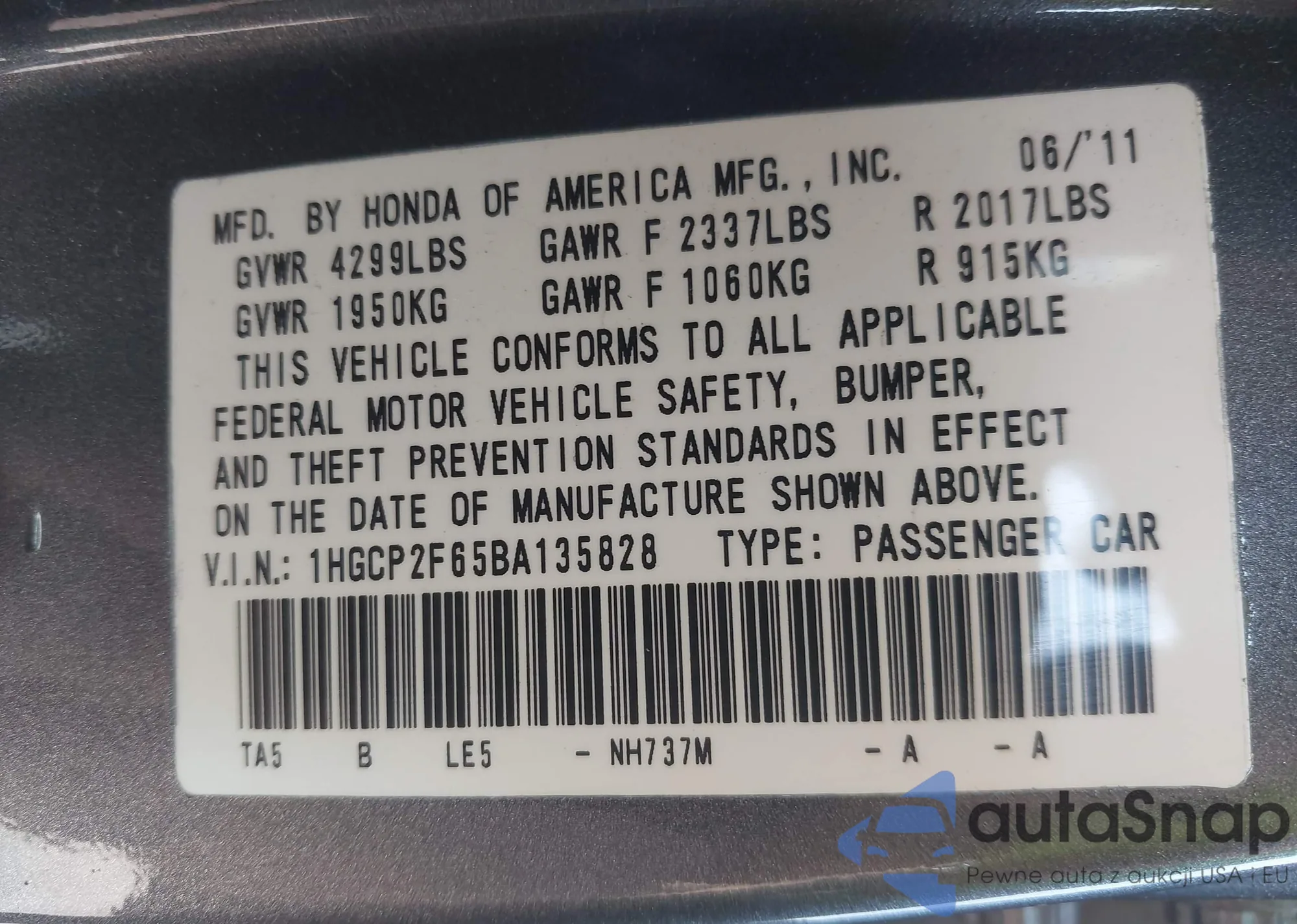 LOT: 42596432 VIN: 1HGCP26809A085237
