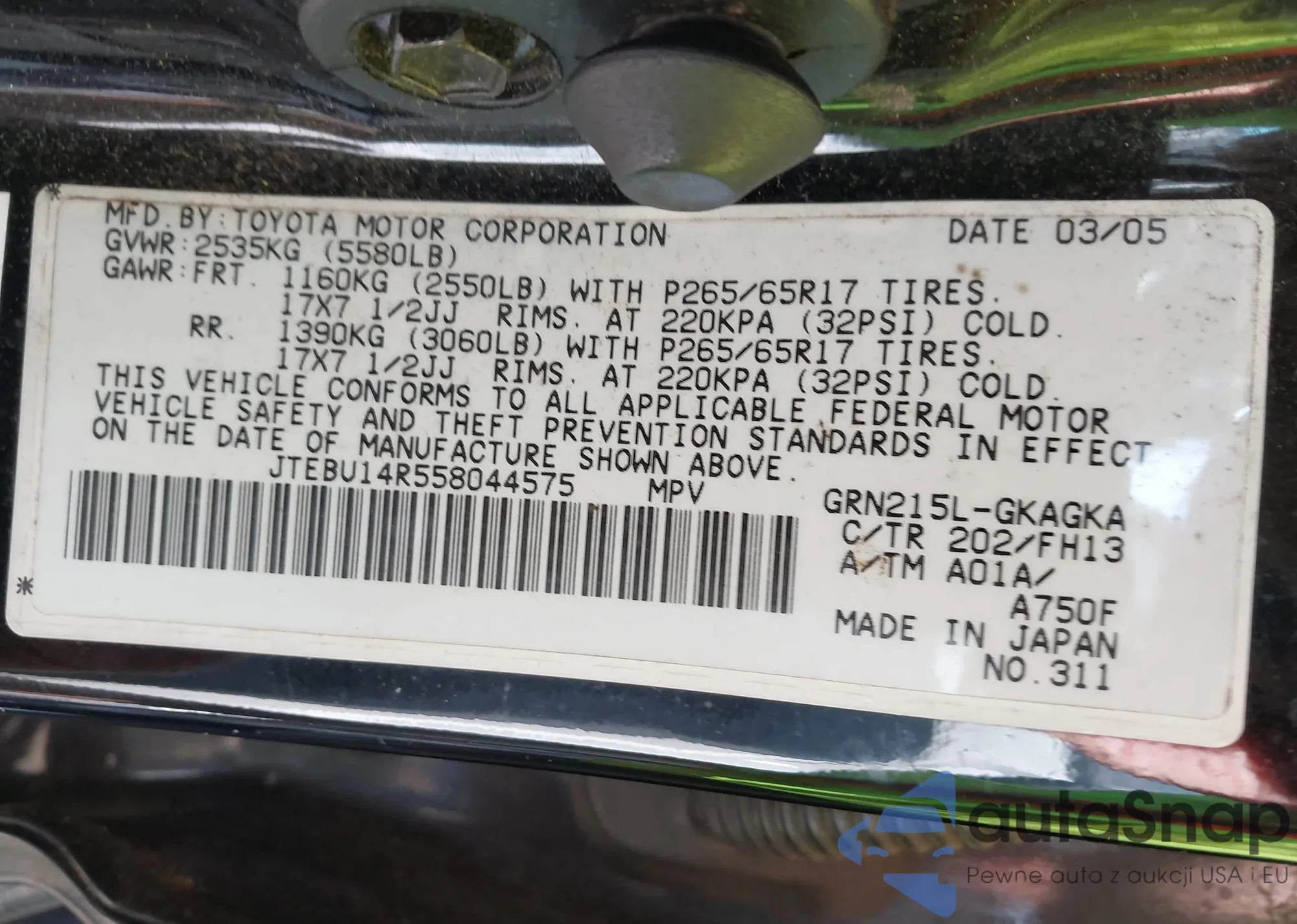 LOT: 42734195 VIN: JTEBT17R758026870