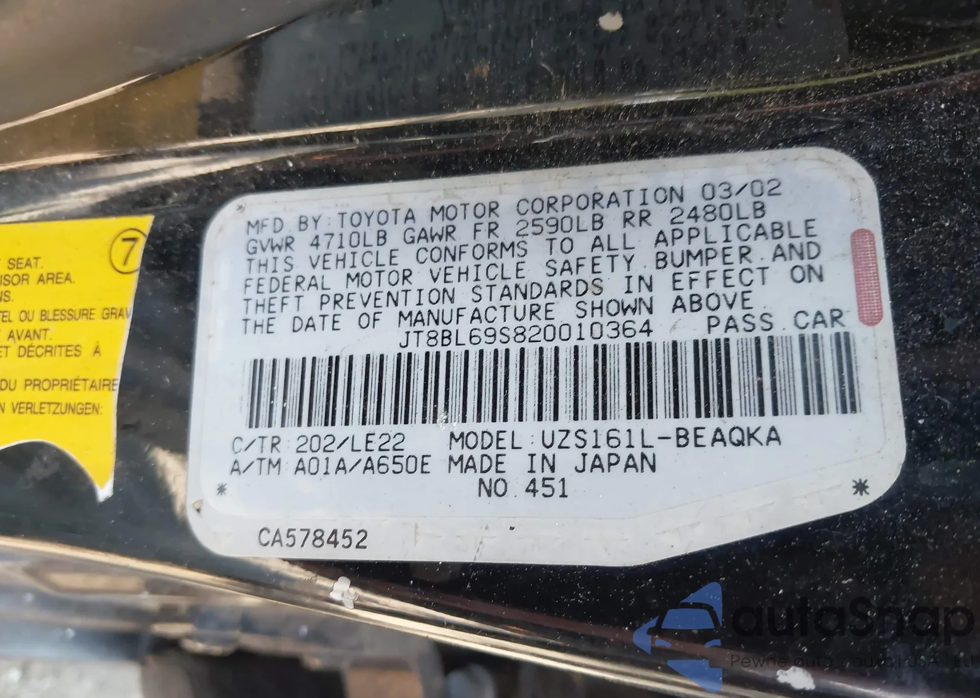 LOT: 42592152 VIN: JT8BL69S820010364