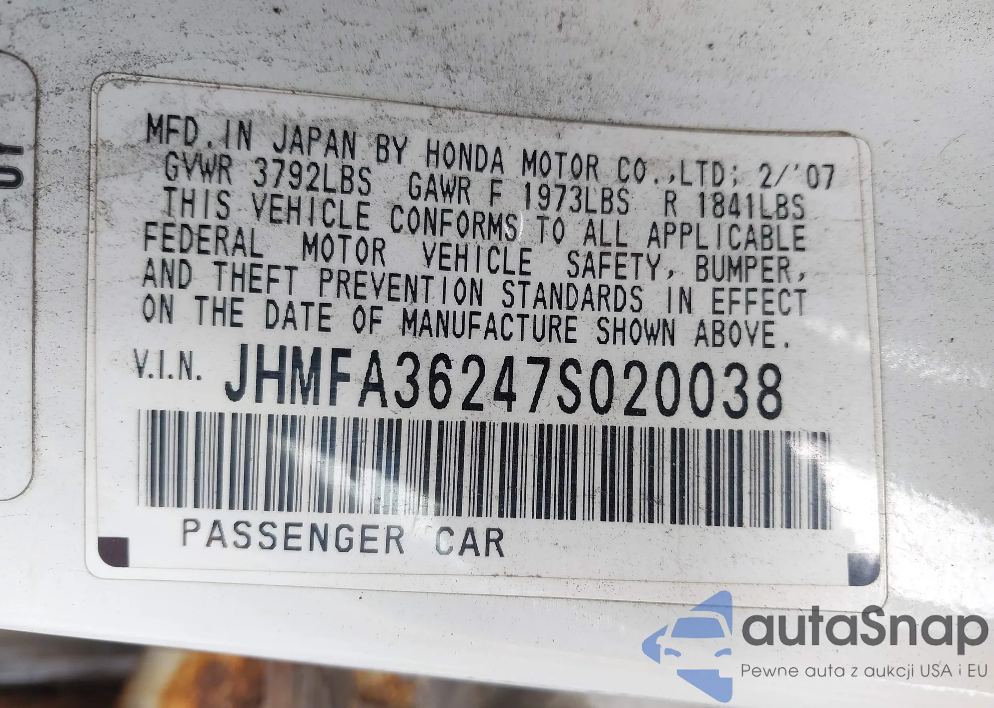 • VIN JHMFA36247S020038