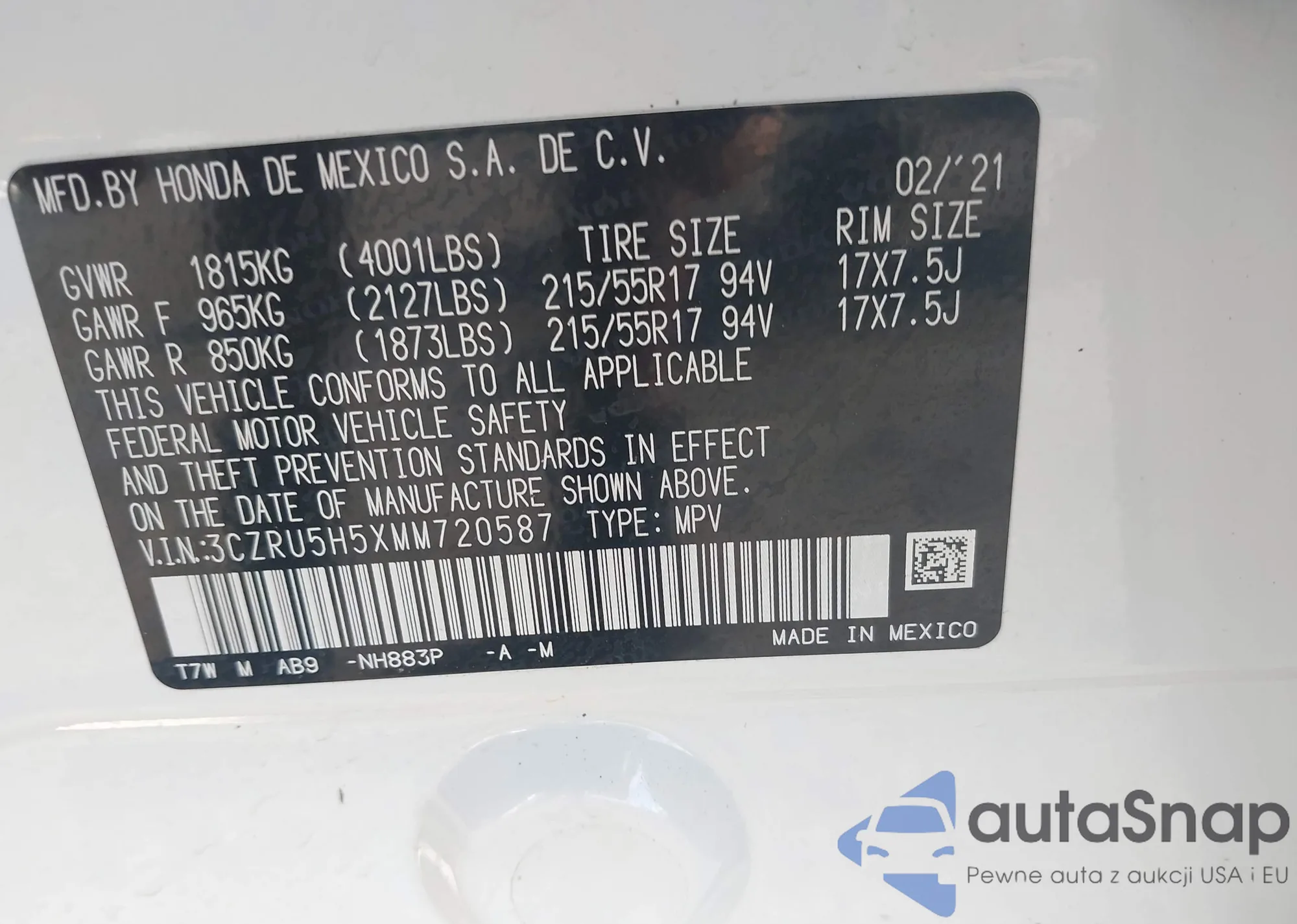 • VIN 3CZRU5H5XMM720587