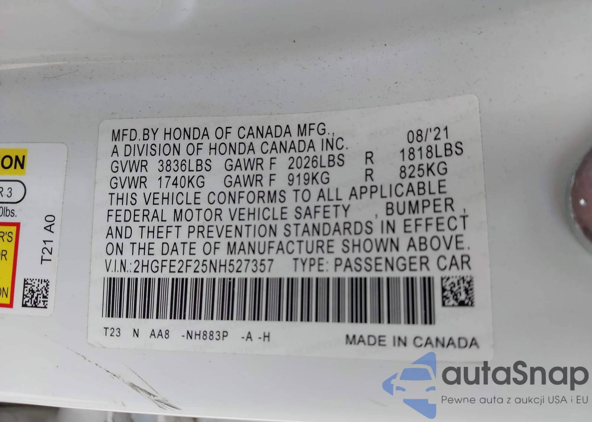 LOT: 42308558 VIN: 2HGFE2F25NH527357
