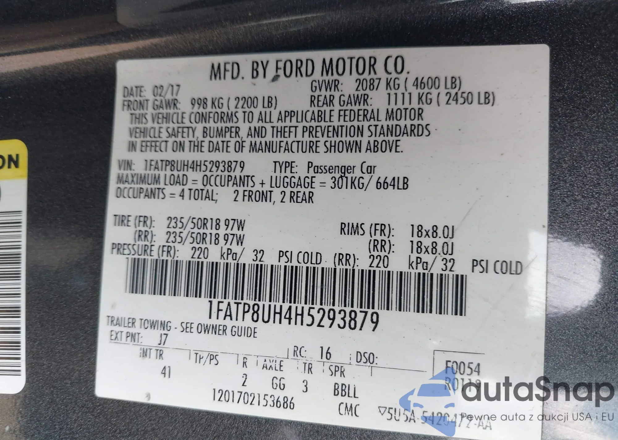 LOT: 42717470 VIN: 1FATP8UH4H5293879