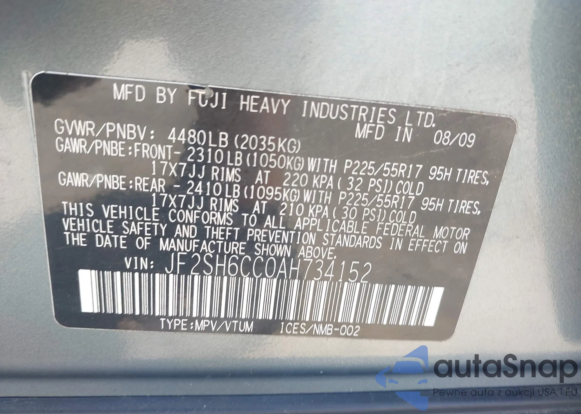 LOT: 42611900 VIN: JF2SH6CC0AH734152