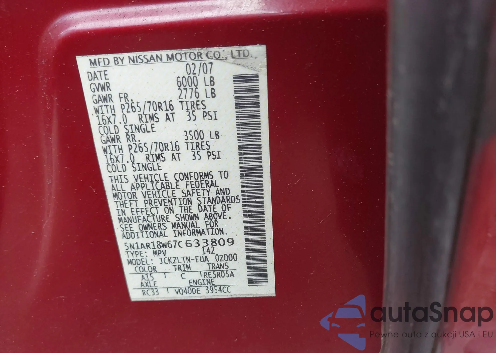 LOT: 40501744 VIN: 5N1AR18W67C633809