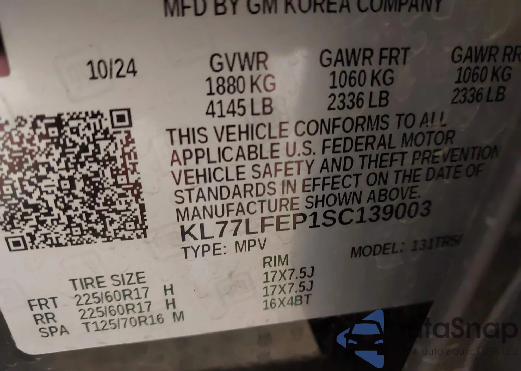 • VIN KL77LFEP1SC139003