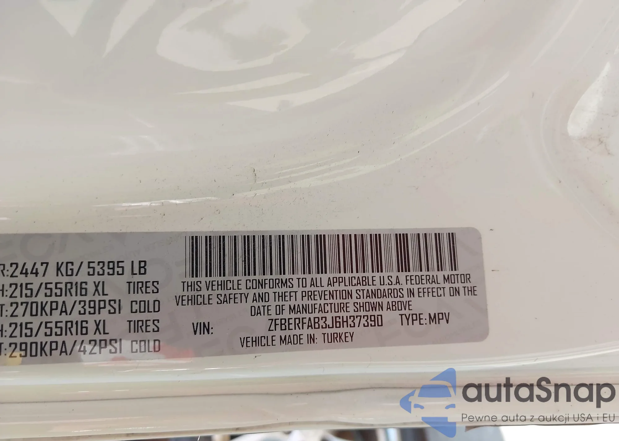 LOT: 42705557 VIN: ZFBERFAB3J6H37390