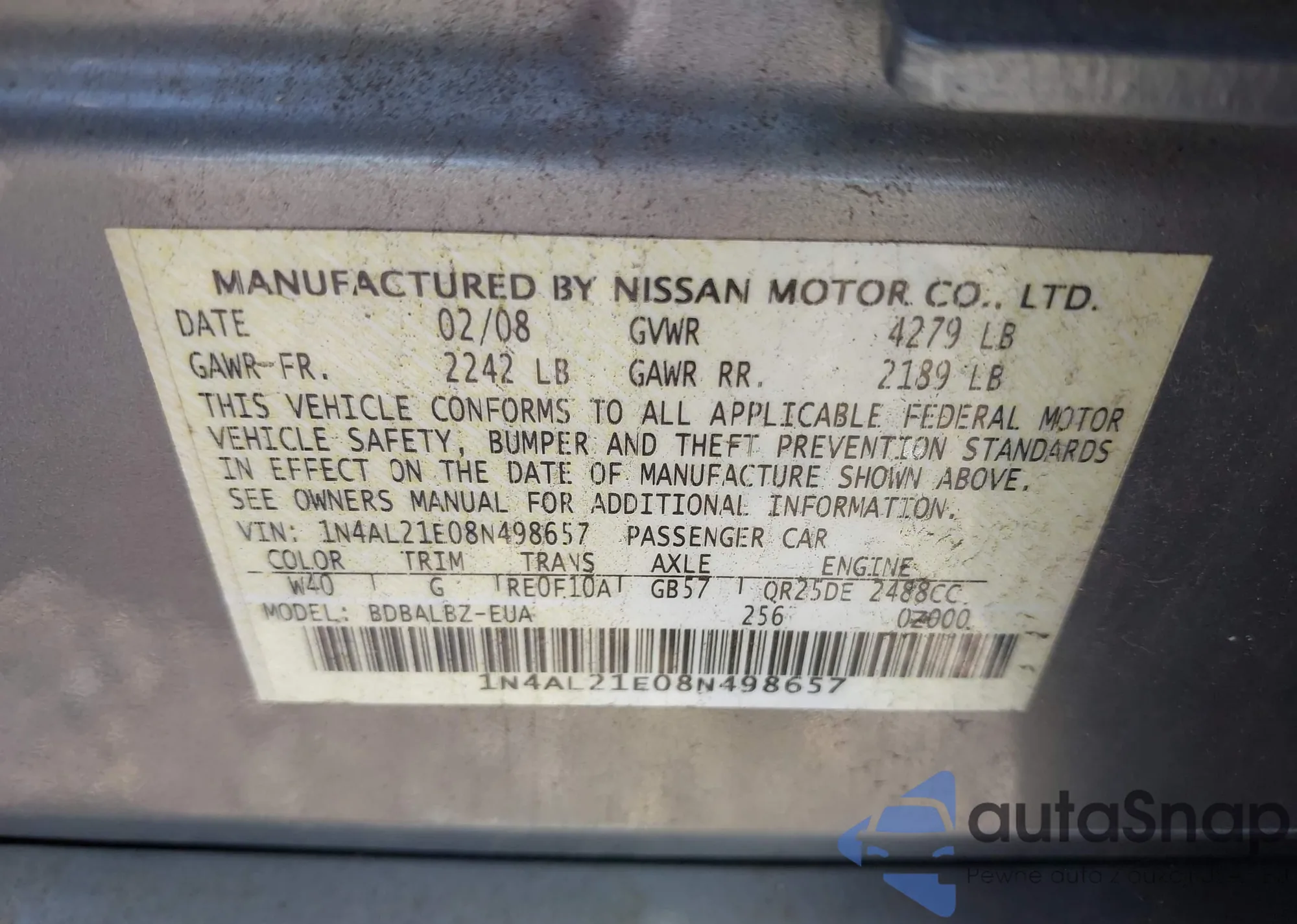 LOT: 42754704 VIN: 1N4AL21E08N498657