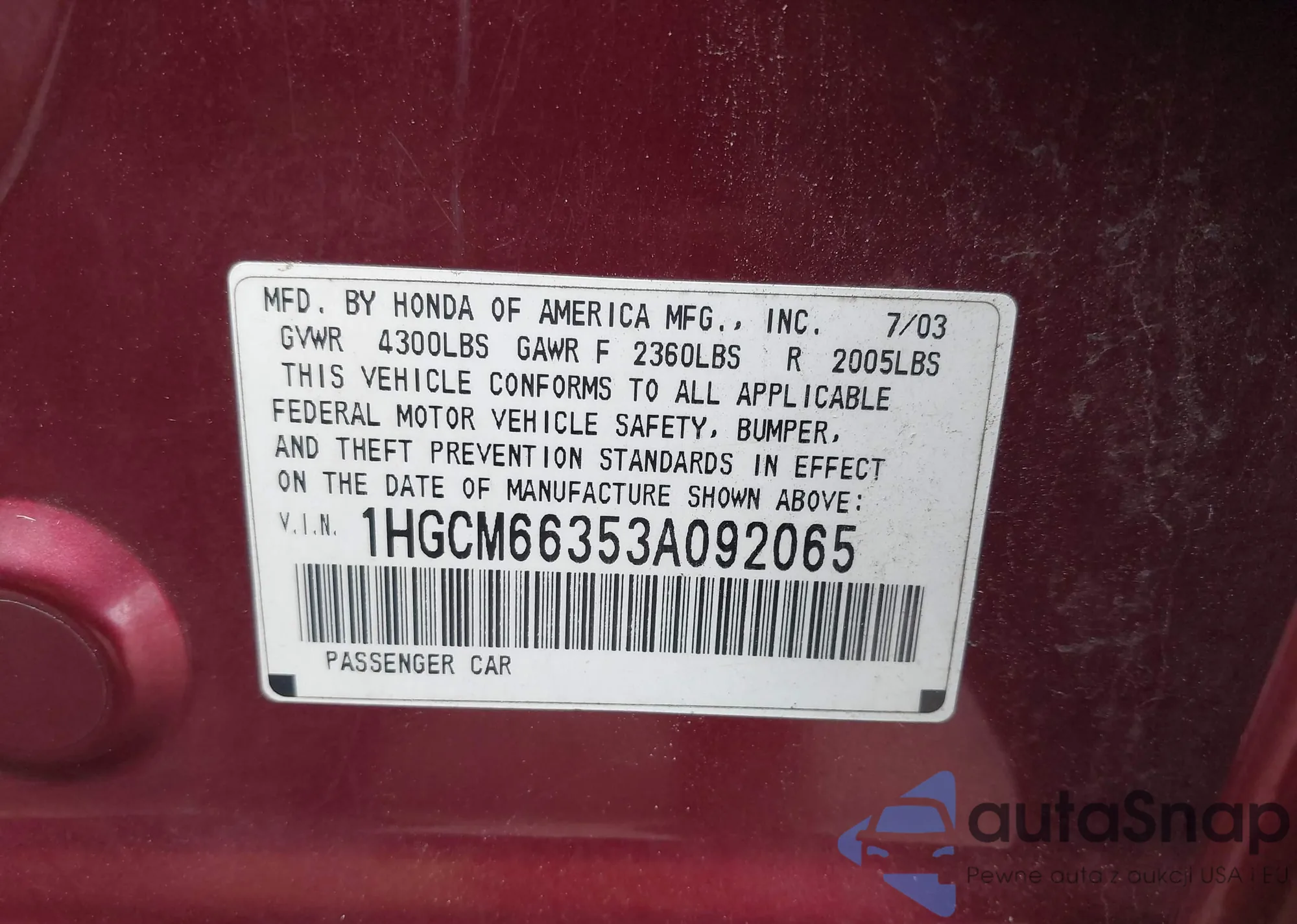 LOT: 39880602 VIN: 1HGCM66353A092065