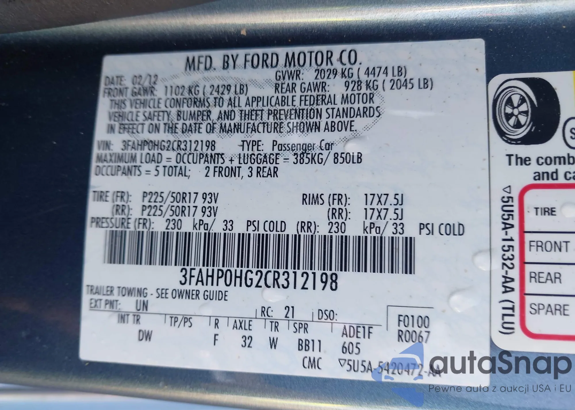 LOT: 42520215 VIN: 3FAHP0GA6BR322289