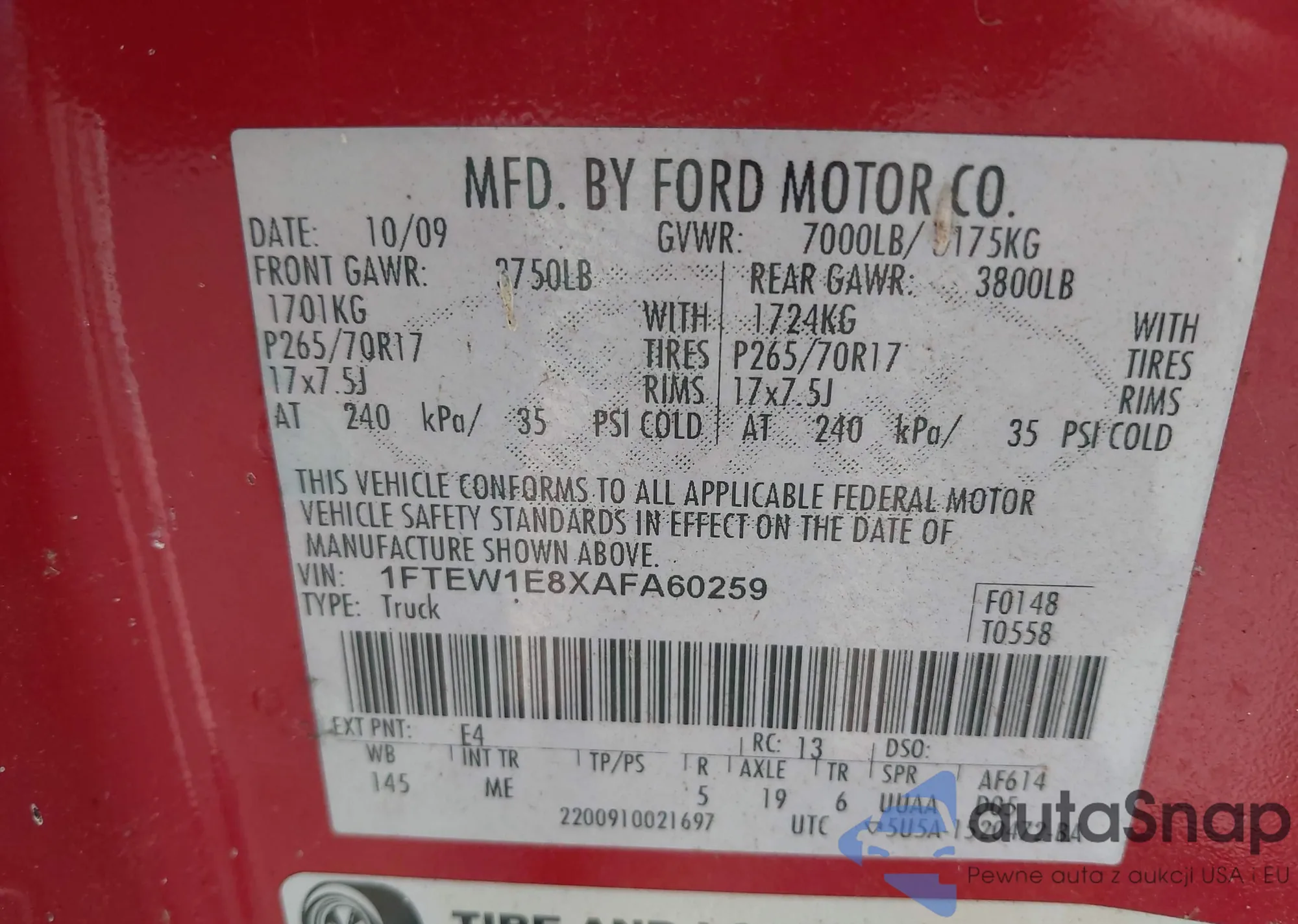 • VIN 1FTEW1E8XAFA60259