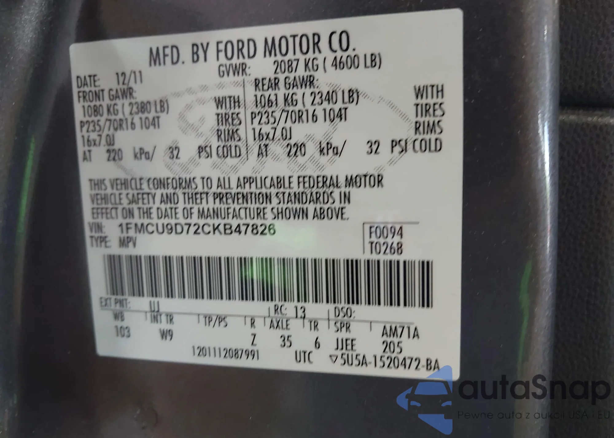 • VIN 1FMCU9D72CKB47826