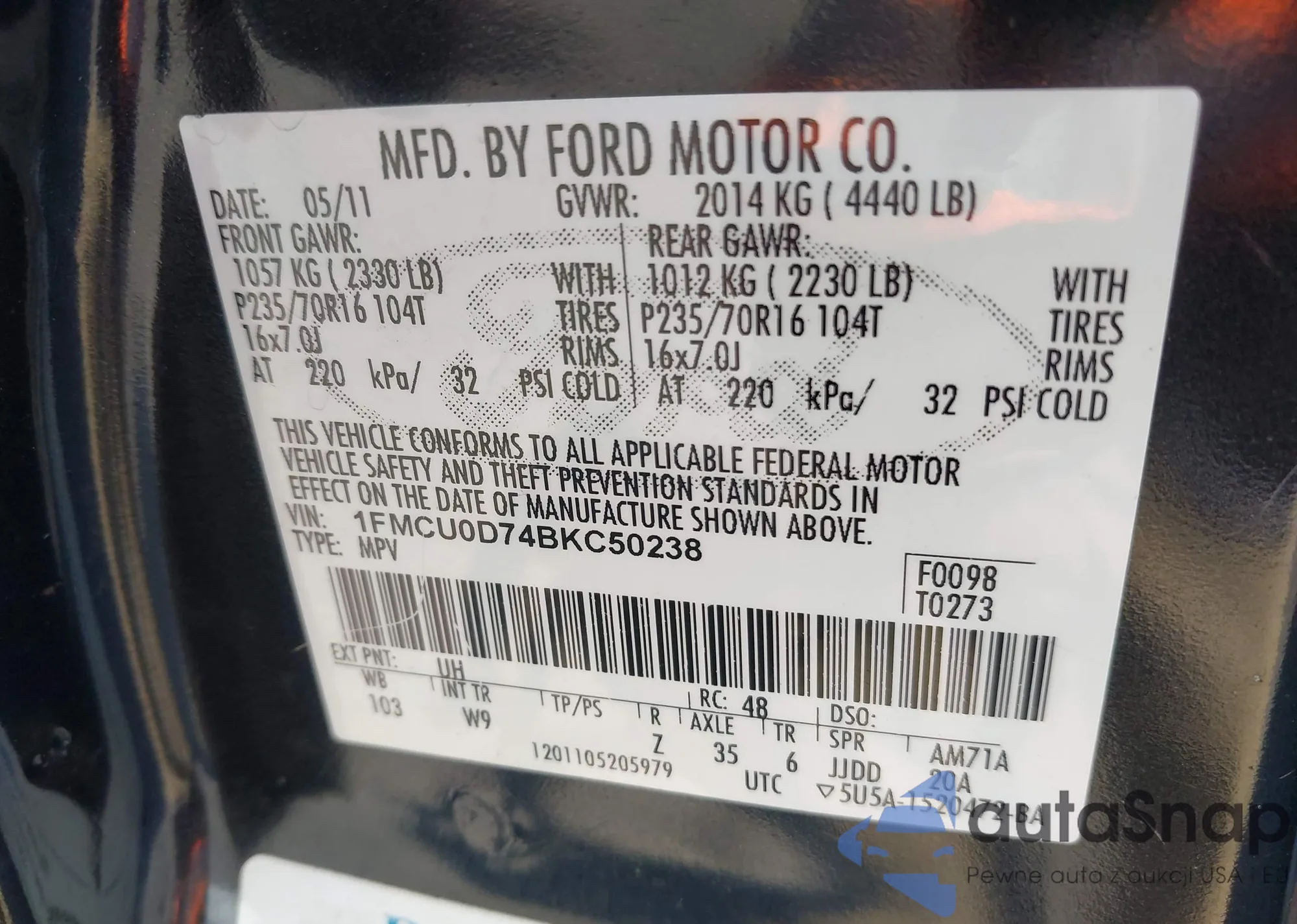 • VIN 1FMCU0D74BKC50238