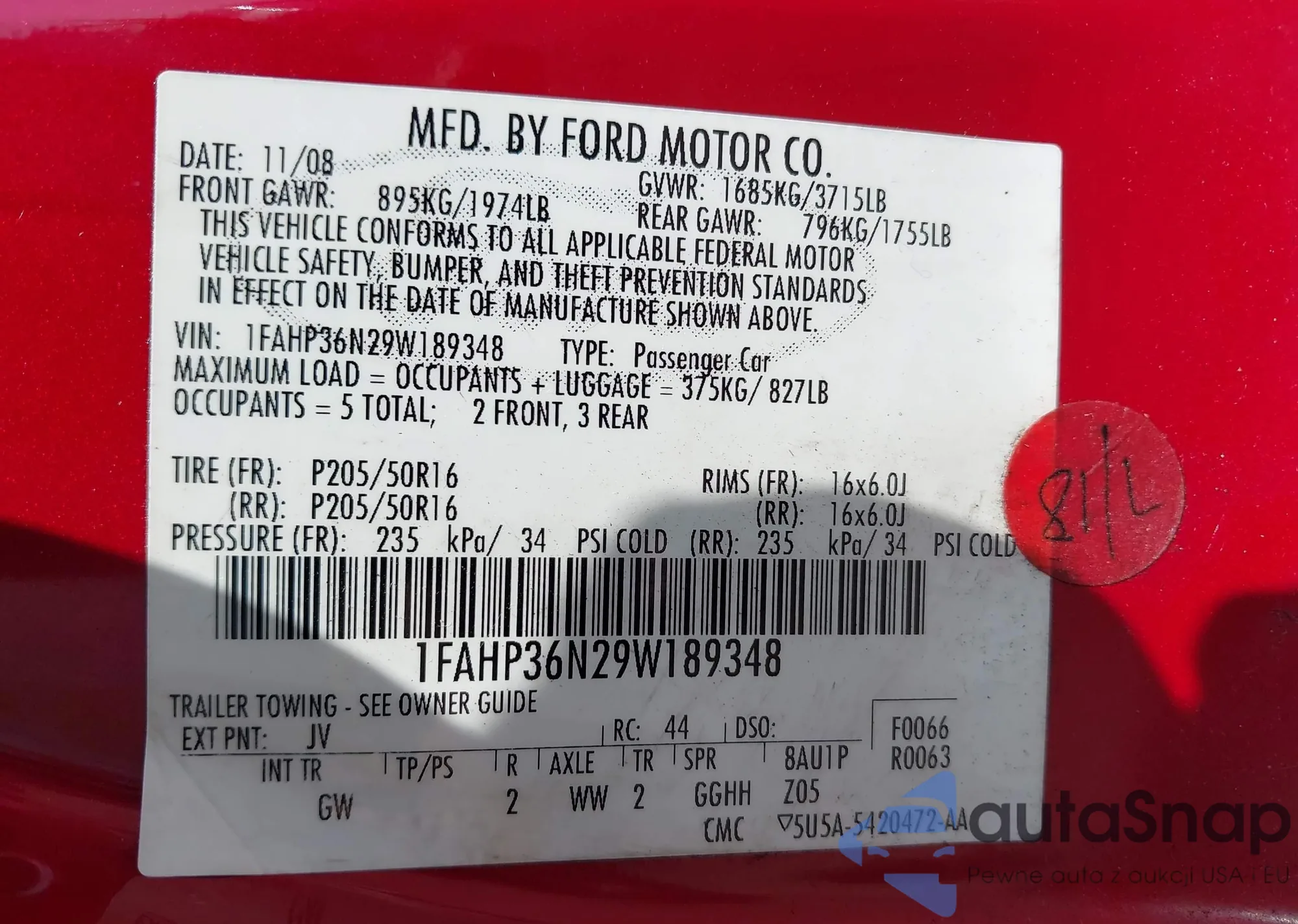 LOT: 42810856 VIN: 1FAHP36N29W189348