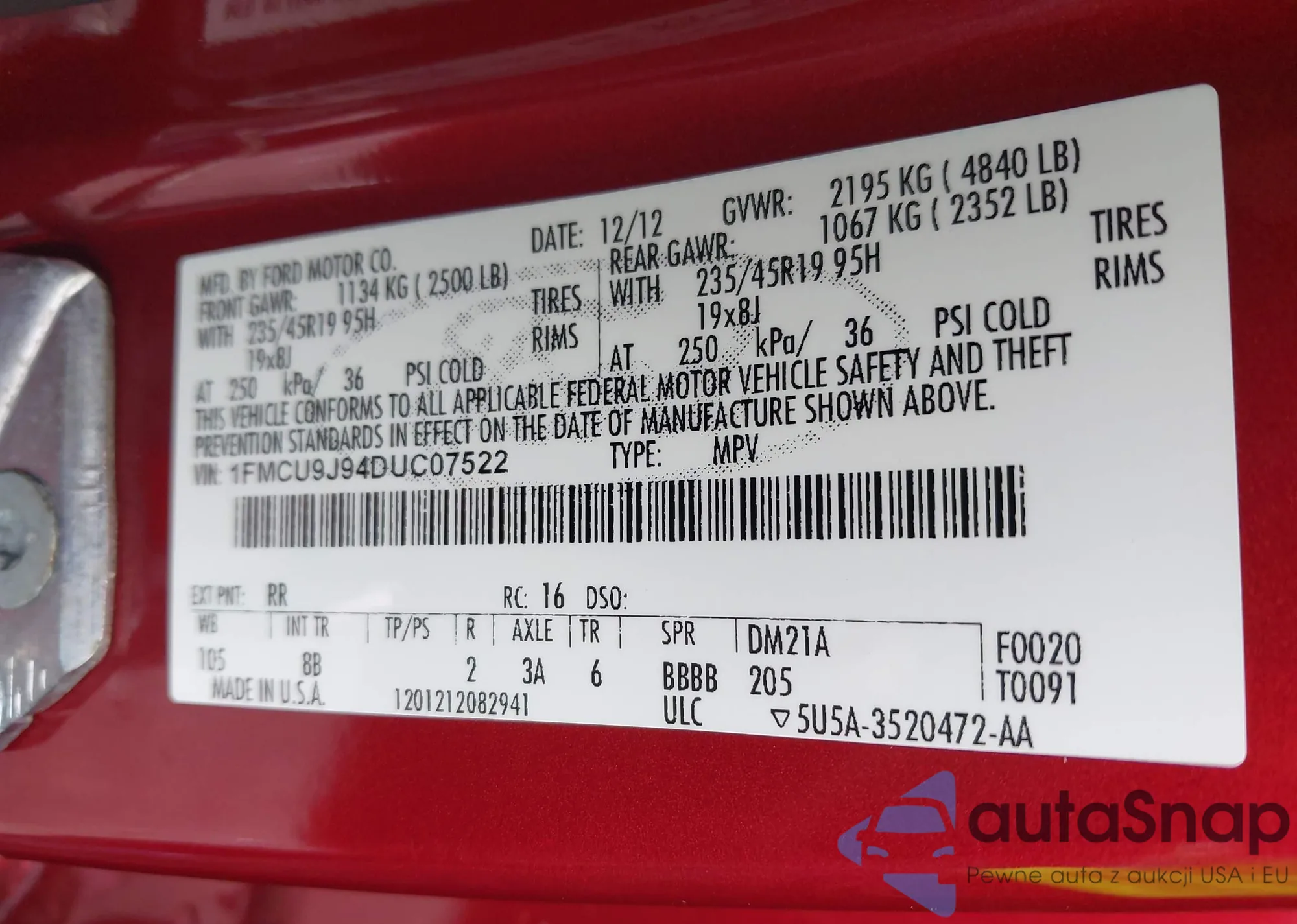 • VIN 1FMCU9J94DUC07522