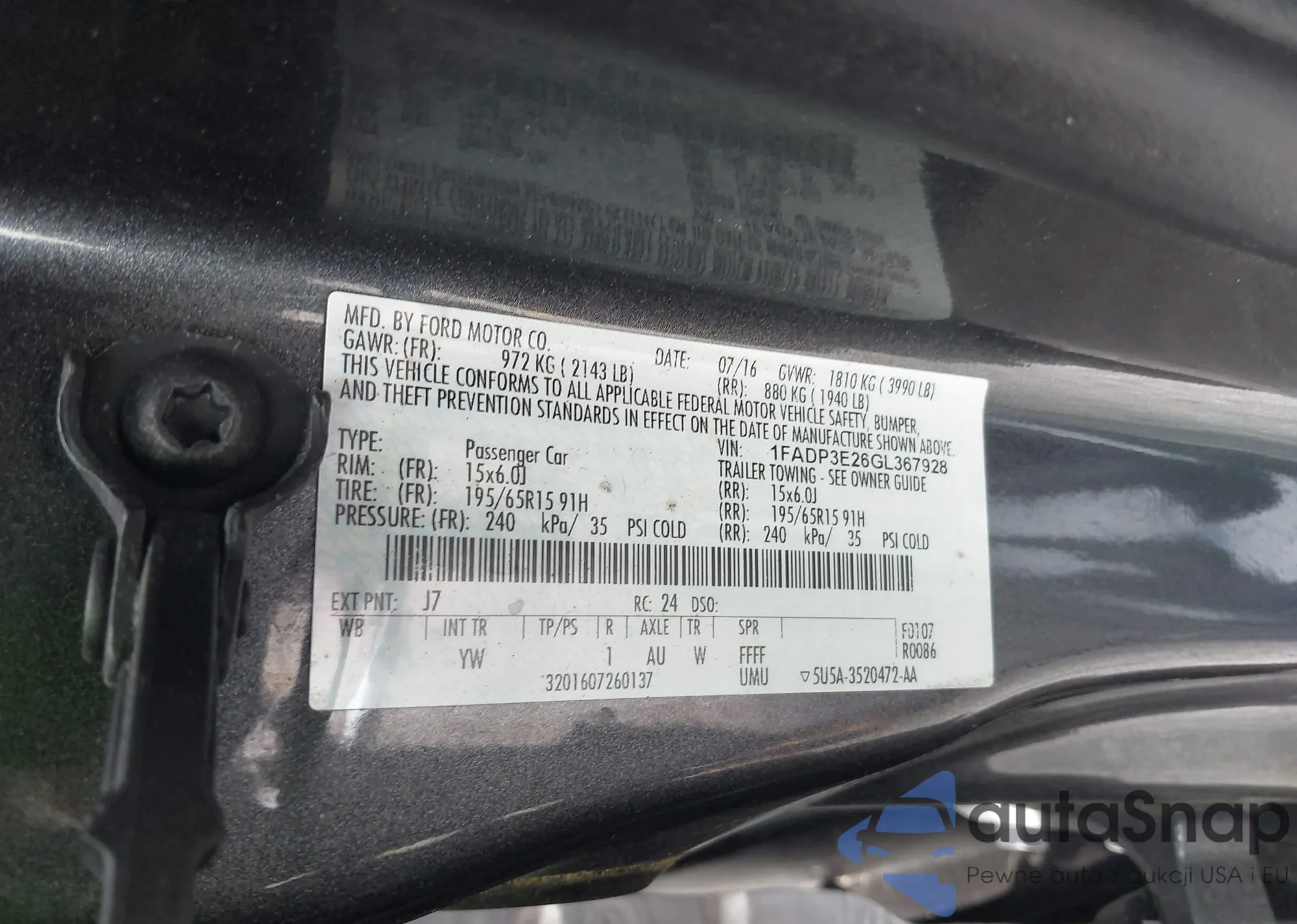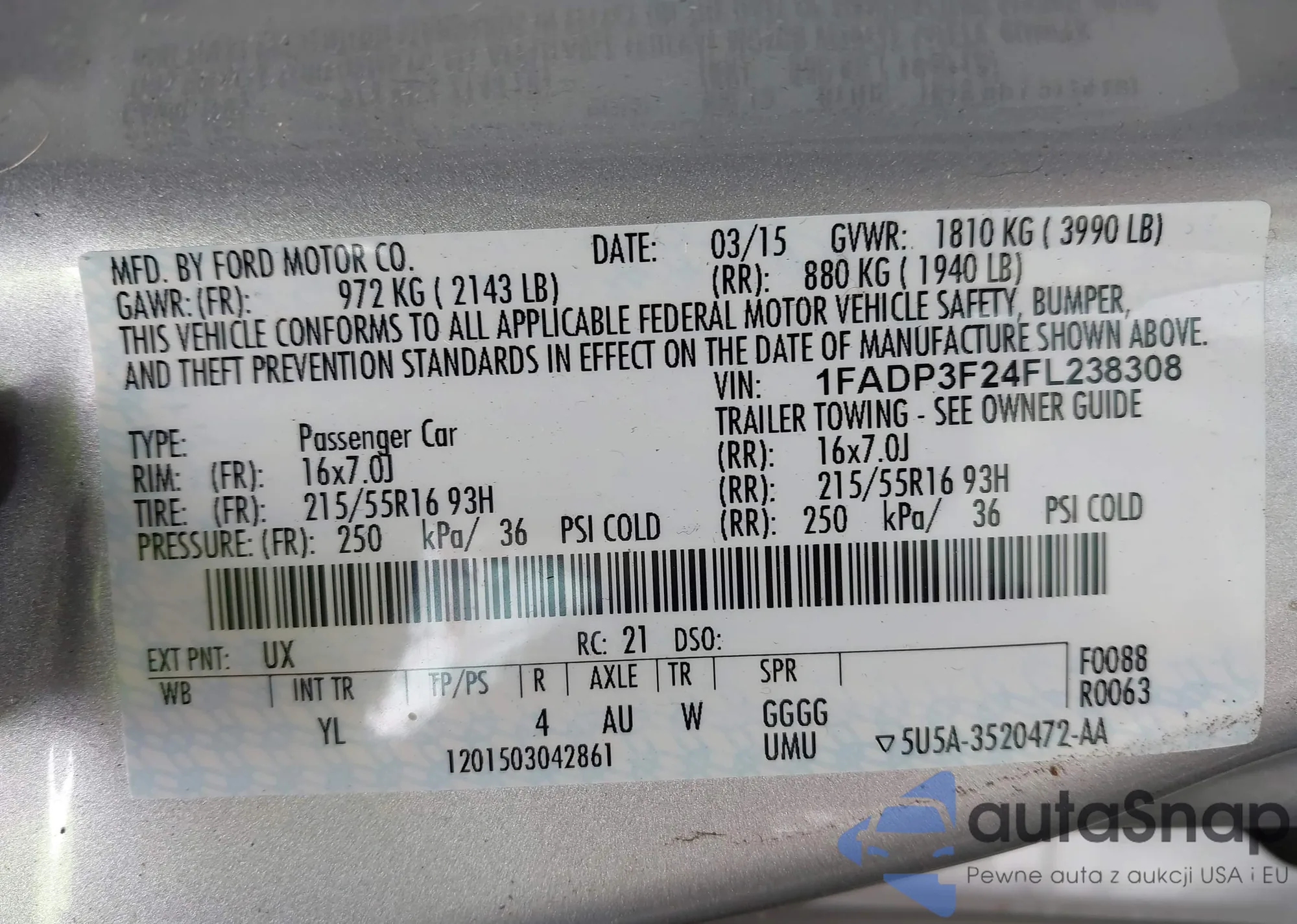 LOT: 42707422 VIN: 1FADP3F24FL238308