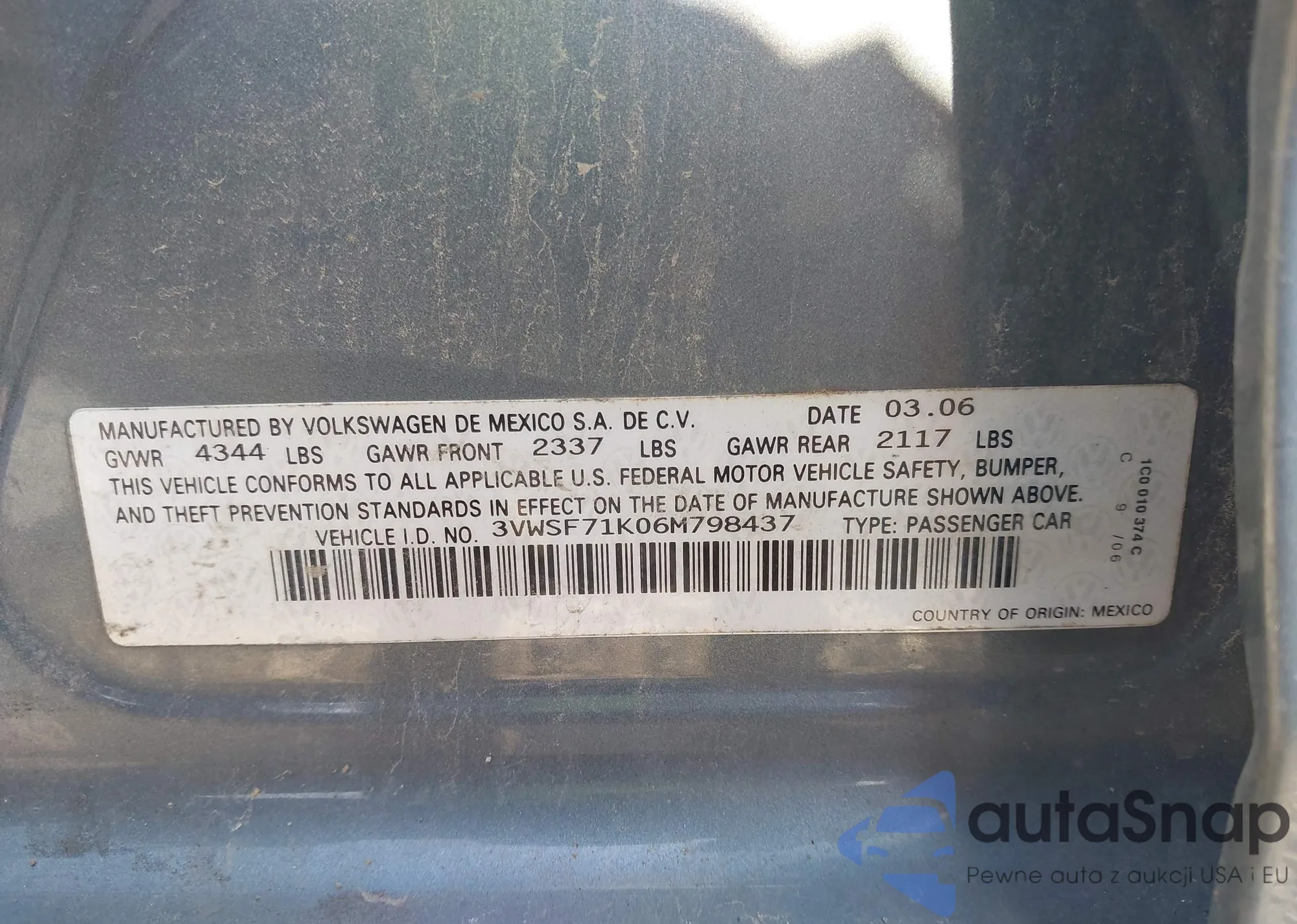 • VIN 3VWSF71K06M798437